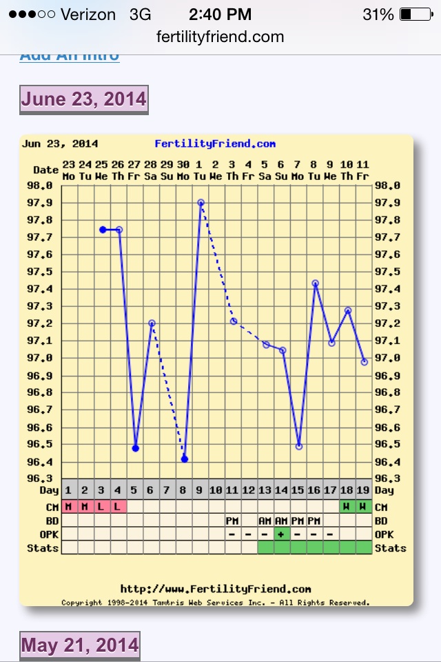 Rants/raves/chart stalks: I got a positive OPK yesterday so I was excited for last night when my husband got home. But things didn't go exactly as planned, so we had a little chat about things this morning and got pretty much no where. He is very much relaxed, and let's just have sex whenever and it'll happen but I keep trying to tell him that there's a fertile window and our best shot is if we hit those days. He should know all of this too because we already have a daughter. Regardless, we are keeping on keeping on and things just keep going. So basically I'm tired and a little frustrated with the hubs. On the positive side, we're going to a Royals game tonight and I haven't been for years so I'm excited. I love baseball!