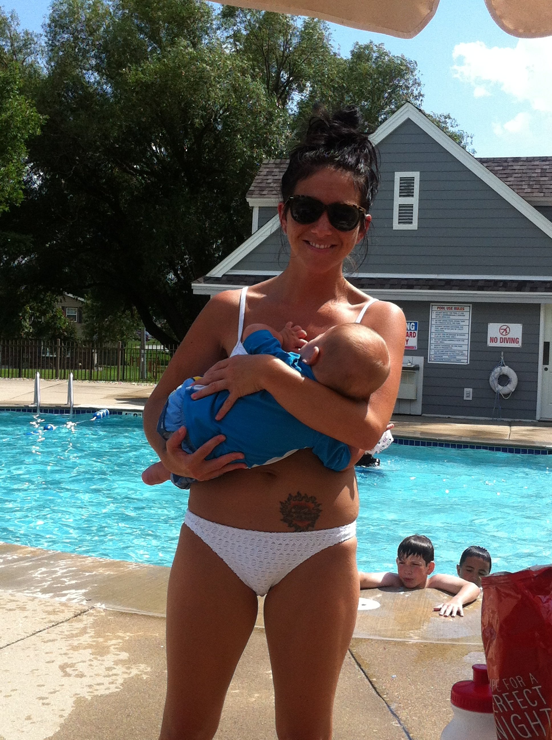 I'm in awe of you for a few reasons. Well, the obvious rocking bikini bod. The fact that you have five kids at the pool! I dread taking two to the store And nursing in public. I have yet to build up the courage to do it.