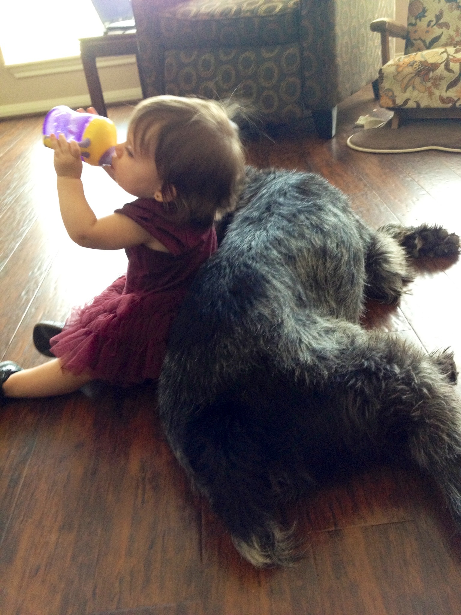 We have two dachshund-poodle mix rescues. Heidi and Hector, they are 5 years old. Still not quite sure about this human sister business. They were formerly spoiled rotten and will be again once LO is a bit more mobile.