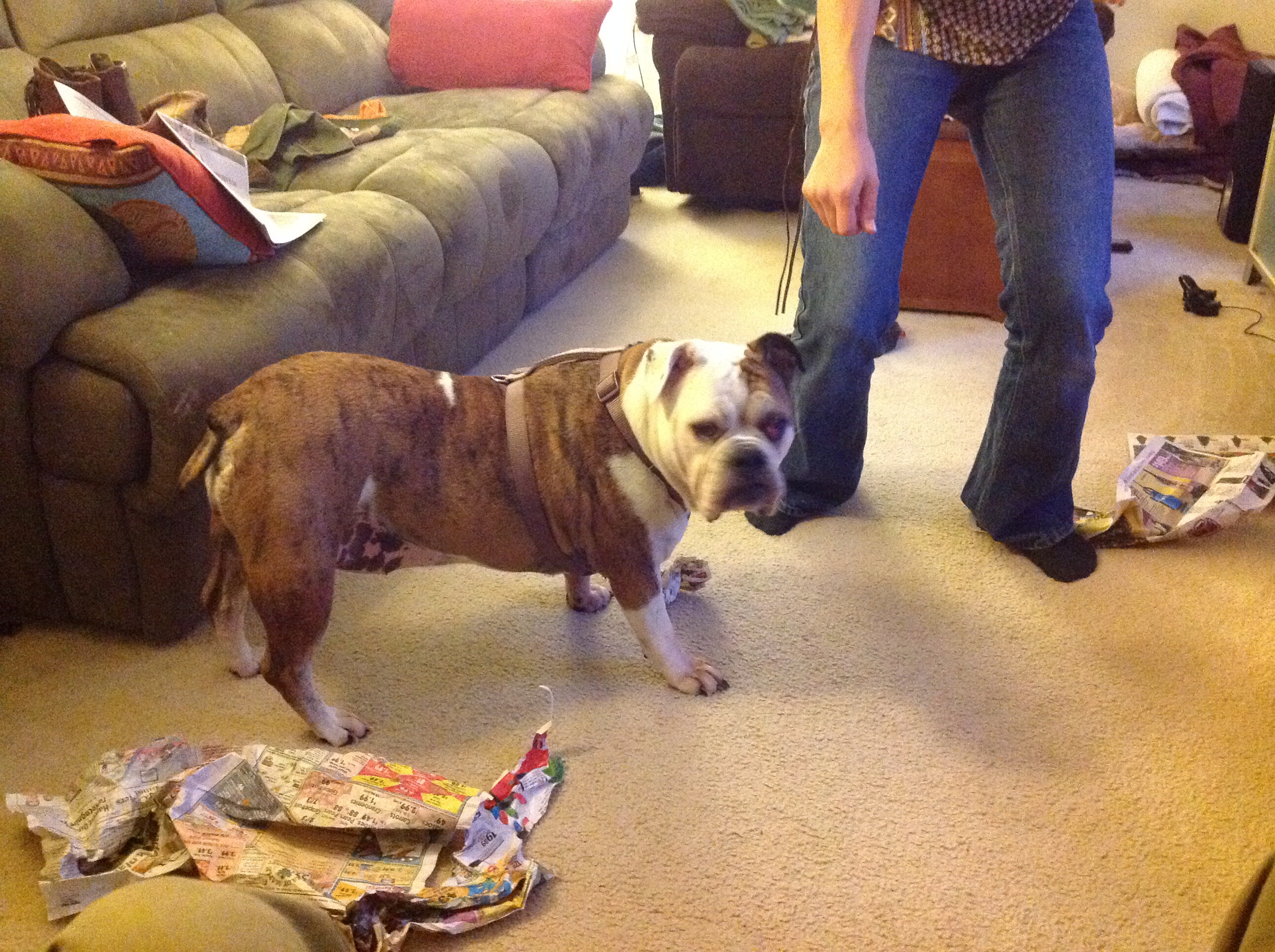 Here is E with Scout, Soda, and Simon (respectively.) Sam and E aren't such good friends.