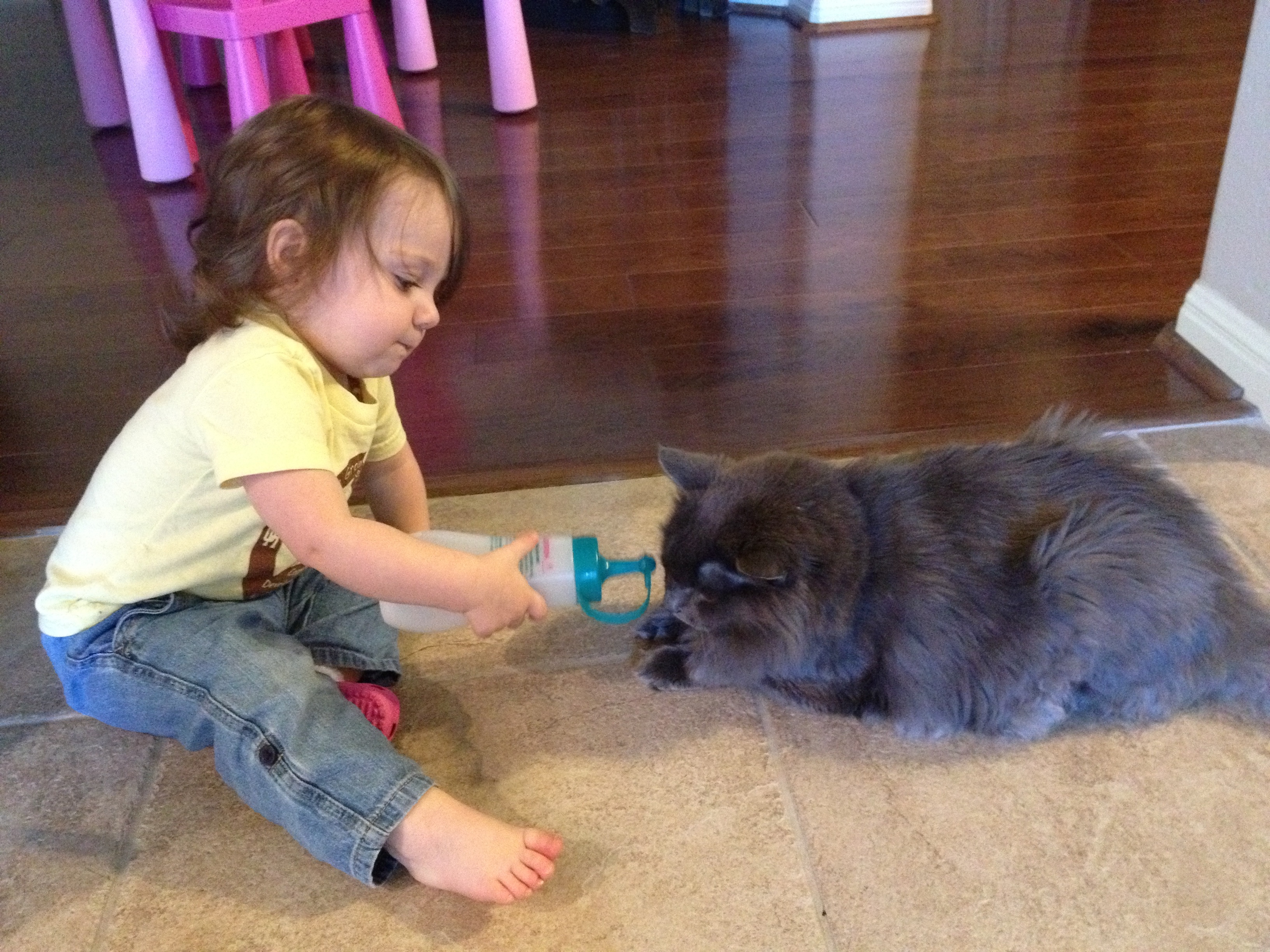 I have a 1 year old Brittany Spaniel, Bailey and a little domestic shorthair named Lucy Lou that's 2.