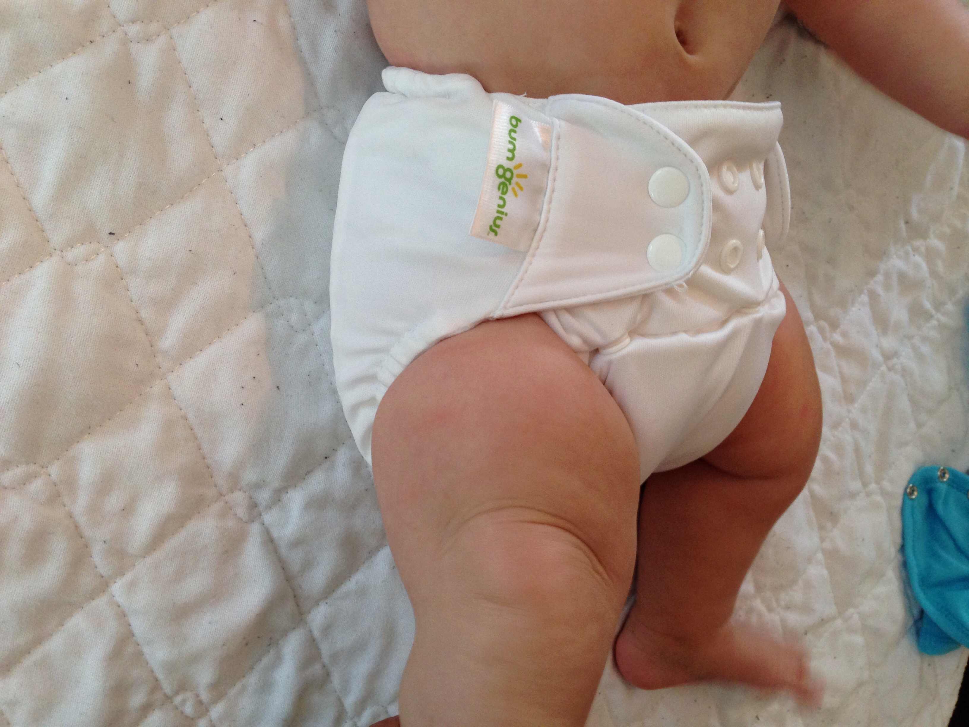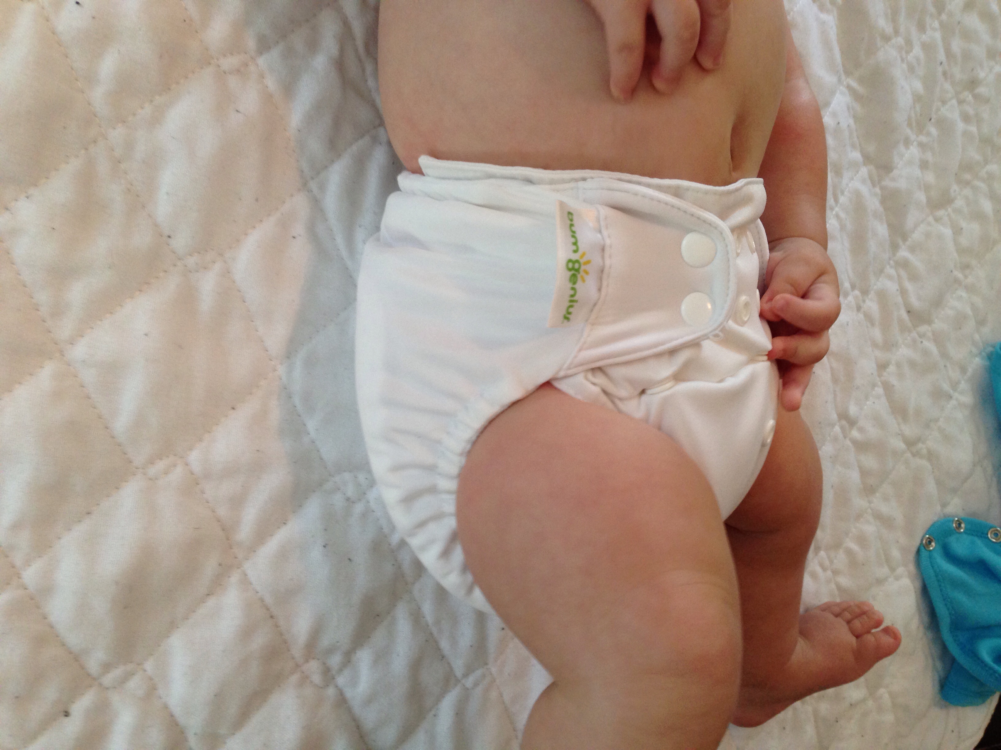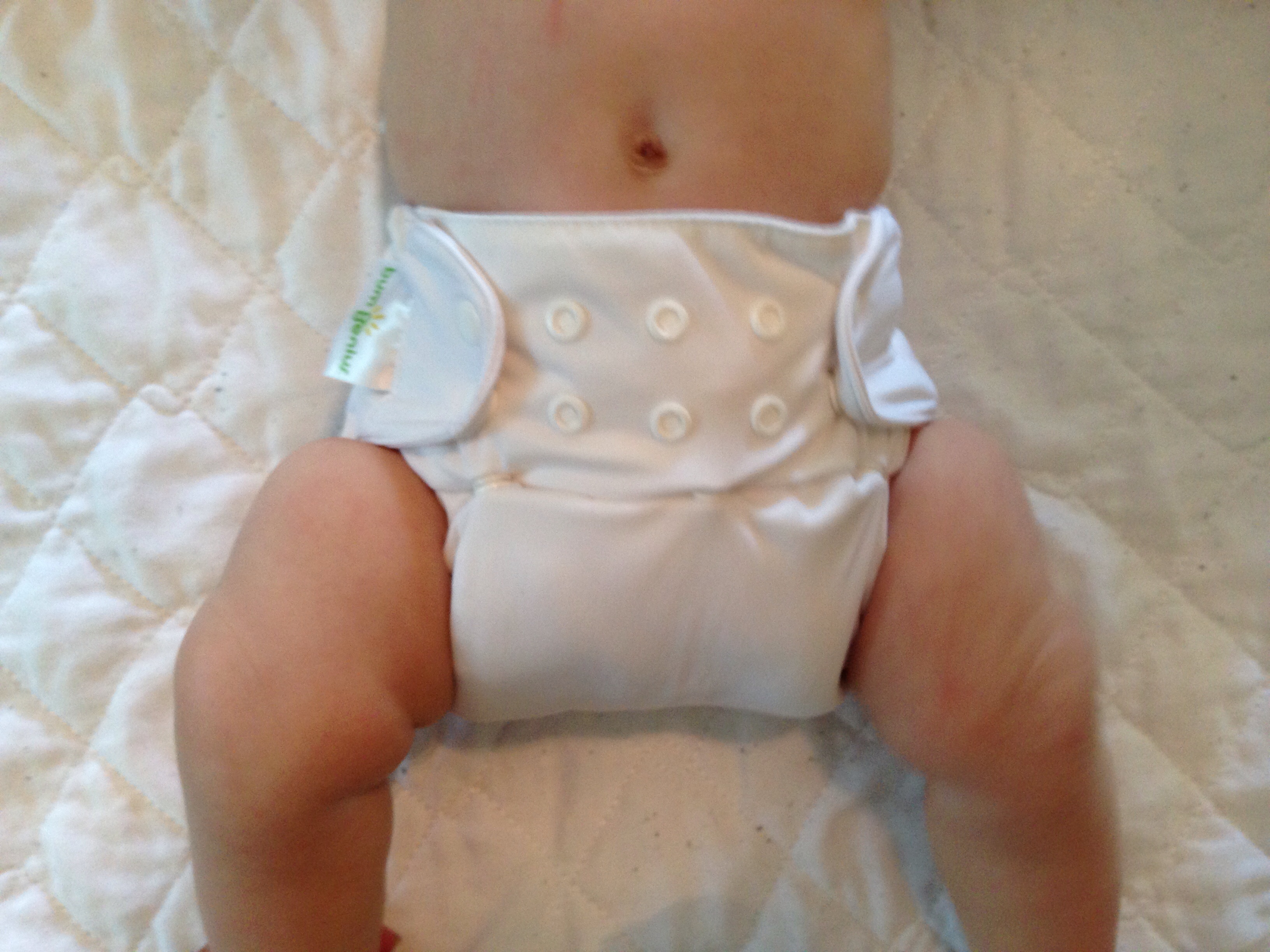 Here is where the leaks occur. I circled them since it's hard to see the wetness lol. Normally it's only on the left (his right leg) but today I tried small rise and this happened. He was wearing the diaper for about 90 min. The inserts were wet in the front but dry near his bum