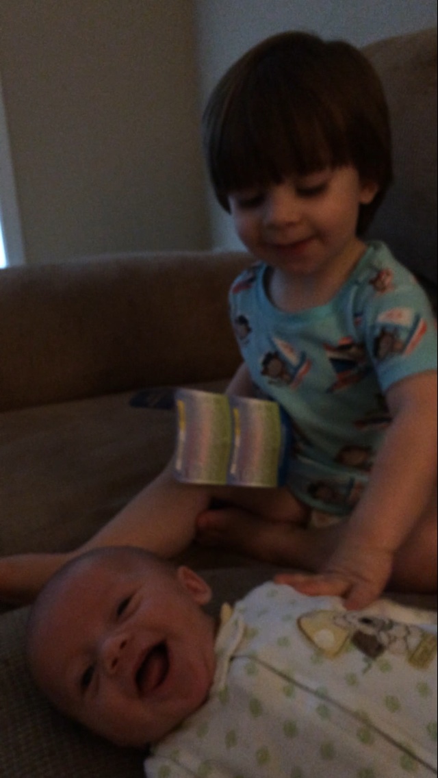 AWing DS making B give the biggest social smiles yet. I'm pretty sure if B could laugh he would have. (this is a screenshot from a video of DS naming all of B's body parts- so cute!)