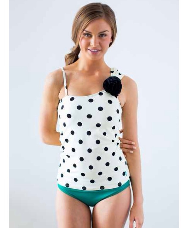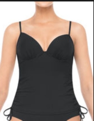 I have the Assets Tankini top. It's just plain black. I wear a white bikini bottom. It makes me feel slender and gives good oomph to the Tatas wish there was a better pic. Got it at Tatget.