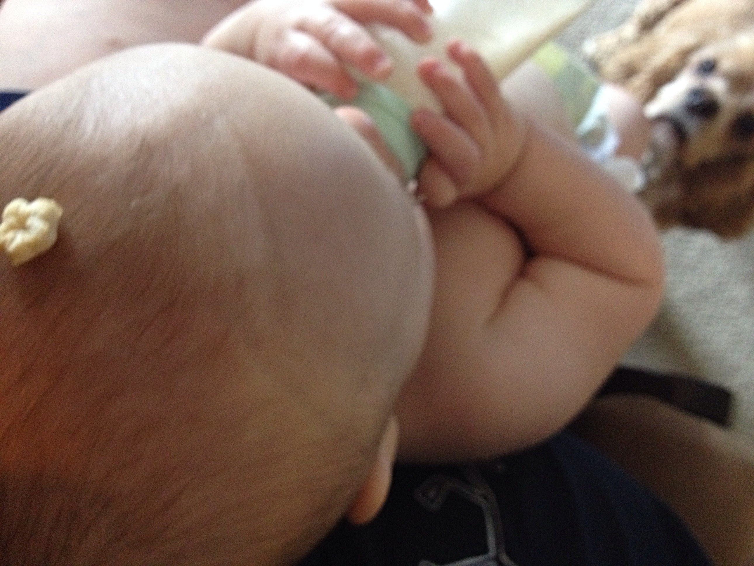 He's only had puffs, peas, carrots, shredded cheese, eggs, and pancakes. Most of which goes to the dogs or ends up in his diaper or...on his head.