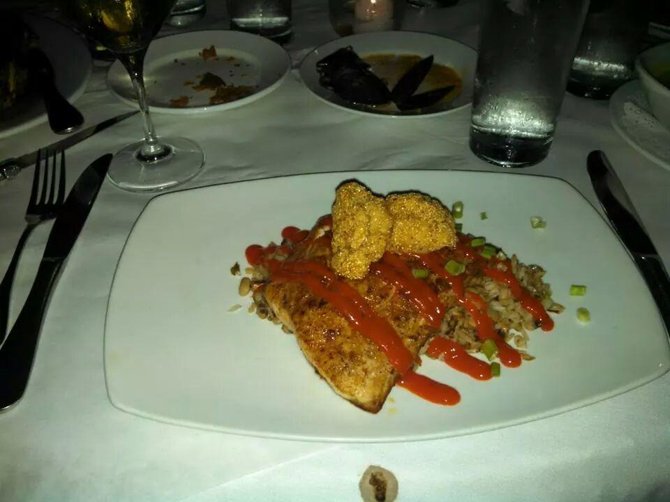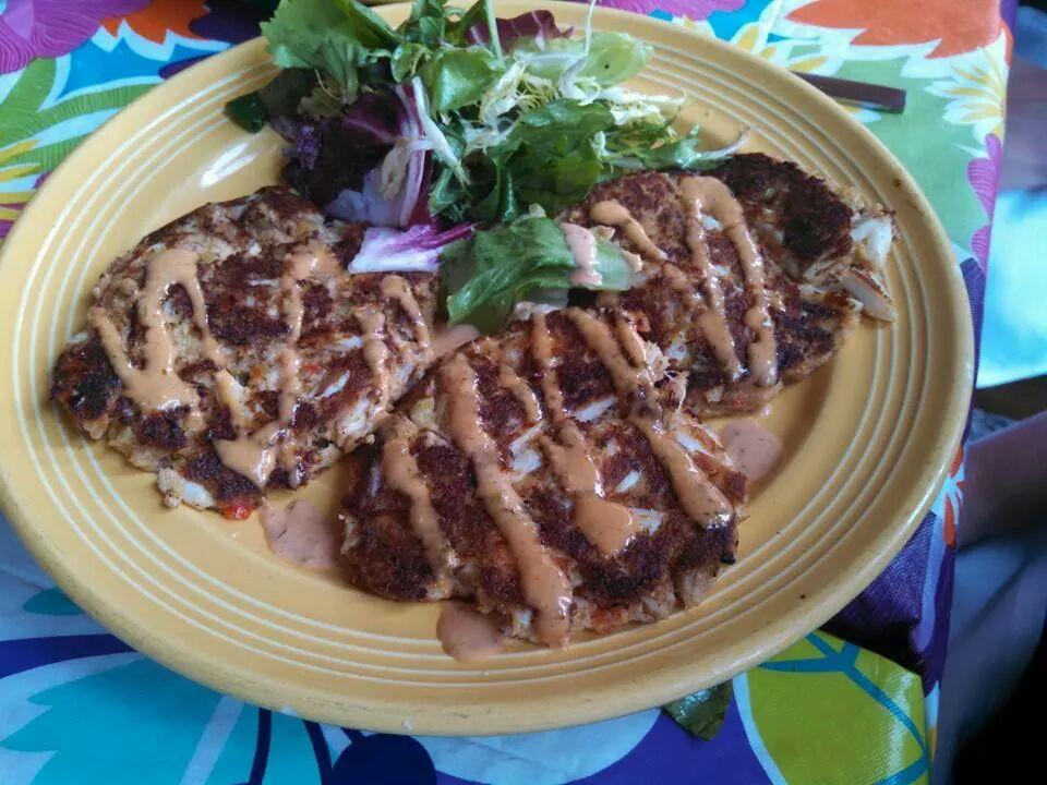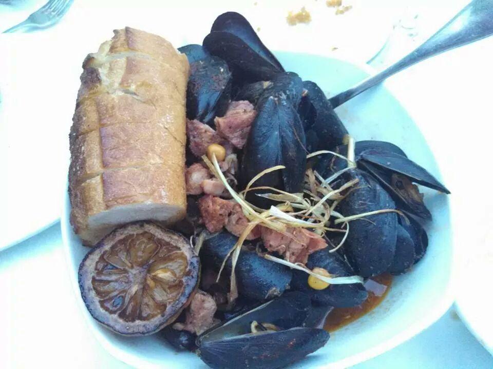 Crab cakes, mussels, and I can't remember what the third thing is.