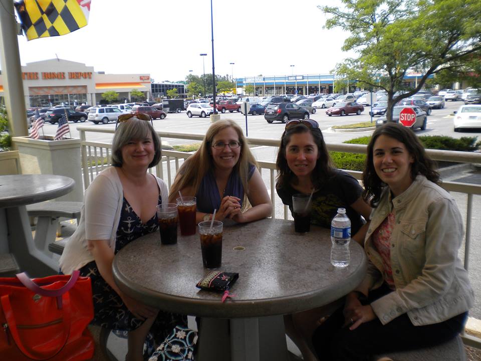 Here's a pic from Saturday's bridesmaid dress shopping excursion. The bride's mom took us out for pizza before going to the bridal shop. I'm on the left in the anchor-print dress, the bride is the blonde one.