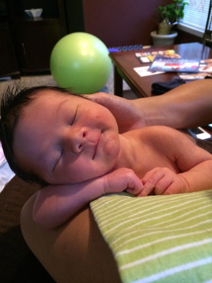 After triage determined I was there to stay, we moved to the labor and delivery room. I wanted an unmedicated delivery and labored for about 7 hours. The pain was manageable through breathing, however when the dr. broke my water at 7 a.m. the contractions got a lot worse. Like blinding, searing pain and I was clinging to the side of the bed for dear life. I asked for the epidural and after an hour, finally got the epidural. It was the best decision I made, because I don't think there was anyway for me to handle the pain for any longer. After the epidural I was so relaxed, it felt like I just got a massage. We were able to relax and sleep for a few hours. When it came time to push, Cameron's heartbeat was dropping dramatically and taking a long time to rise up, the dr. said I was very close to having an emergency c-section due to fetal distress. However once I was on my left side, his heartbeat started to increase. Turns out the cord was wrapped around his neck twice and he also passed muconium. After 1.5 hours of pushing, which is really challenging when your bottom half is asleep, the dr. said that due to my anatomy he'd have to use forceps and vacuum. We just wanted out little guy out safely, and he was born at 6:17 p.m. I had second degree tears, but thank goodness didn't feel anything. Neonatal team was present to check on the baby, and after a few scary seconds of no baby cries, he finally cried. We are home and settled in. Breastfeeding has gone well, and we got lucky with so far an easy baby. We've been able to sleep.