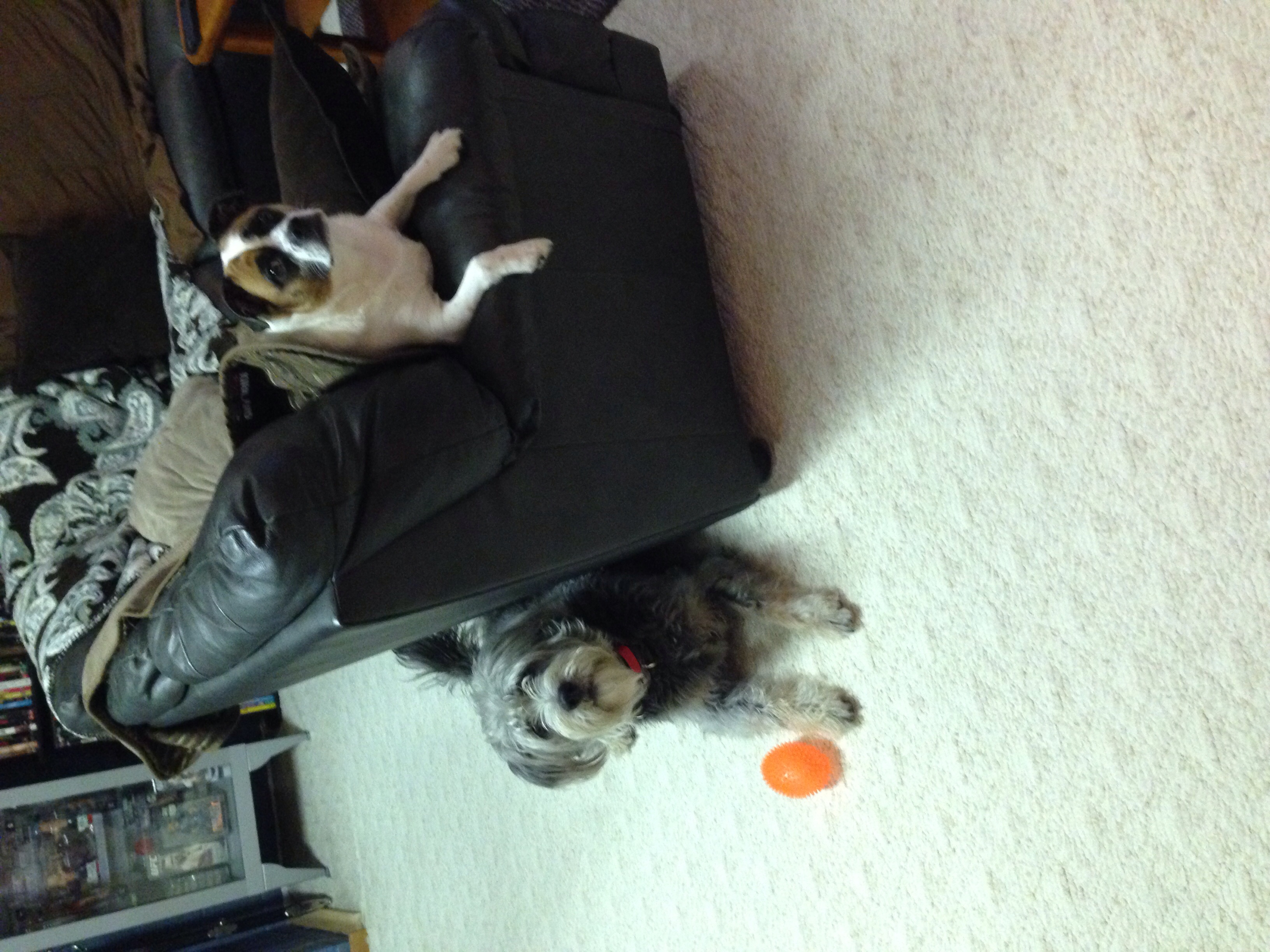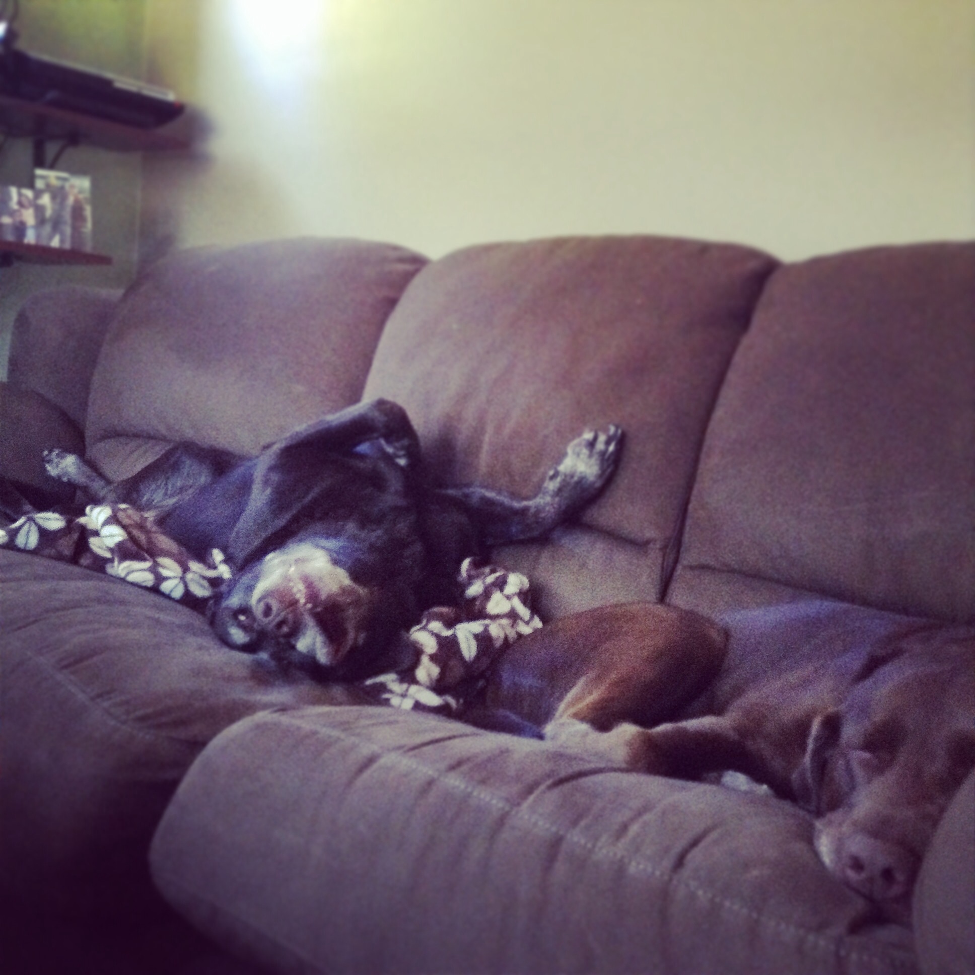 Picture: Kenzie & Koda napping on the couch. Kenzie loves to sleep like that lol.