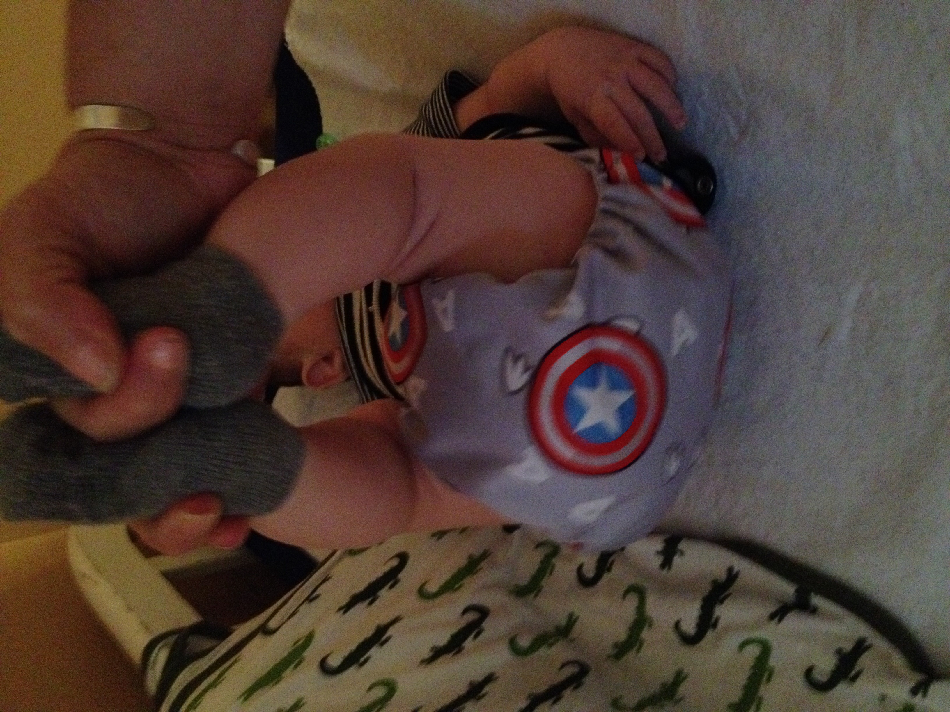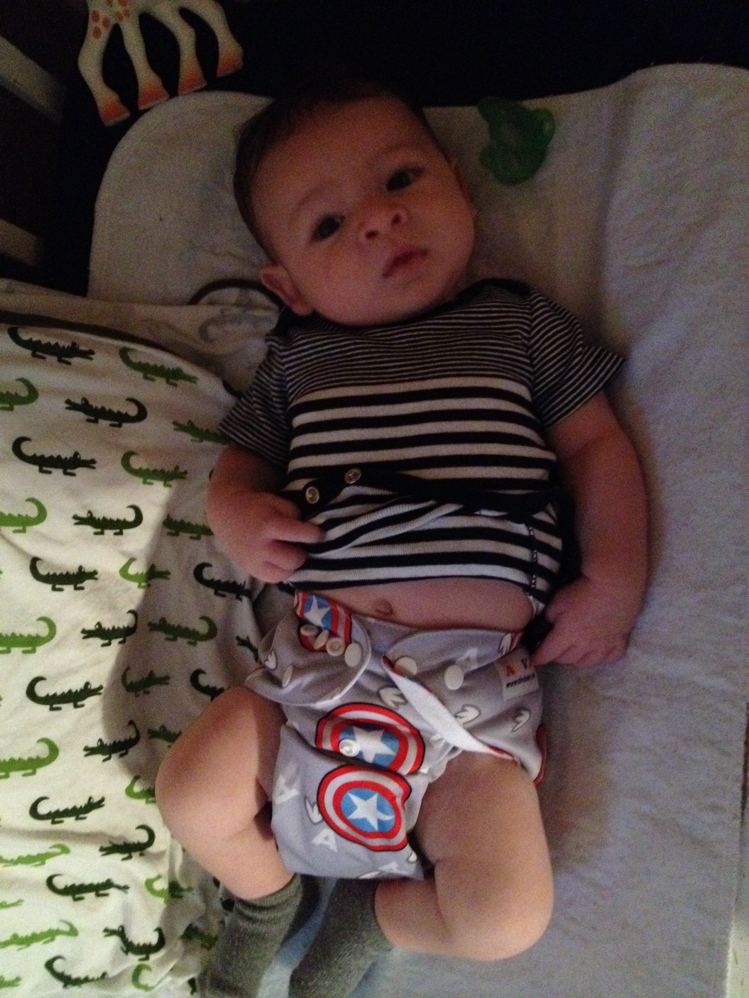 DS is 9 weeks old and weighs 11 lbs. 13 oz. I put my Alva OS pockets on him on a whom the other day to see if they'd fit. They seemed to, so I've been using them during the day for most of this week, and using prefolds at night.
