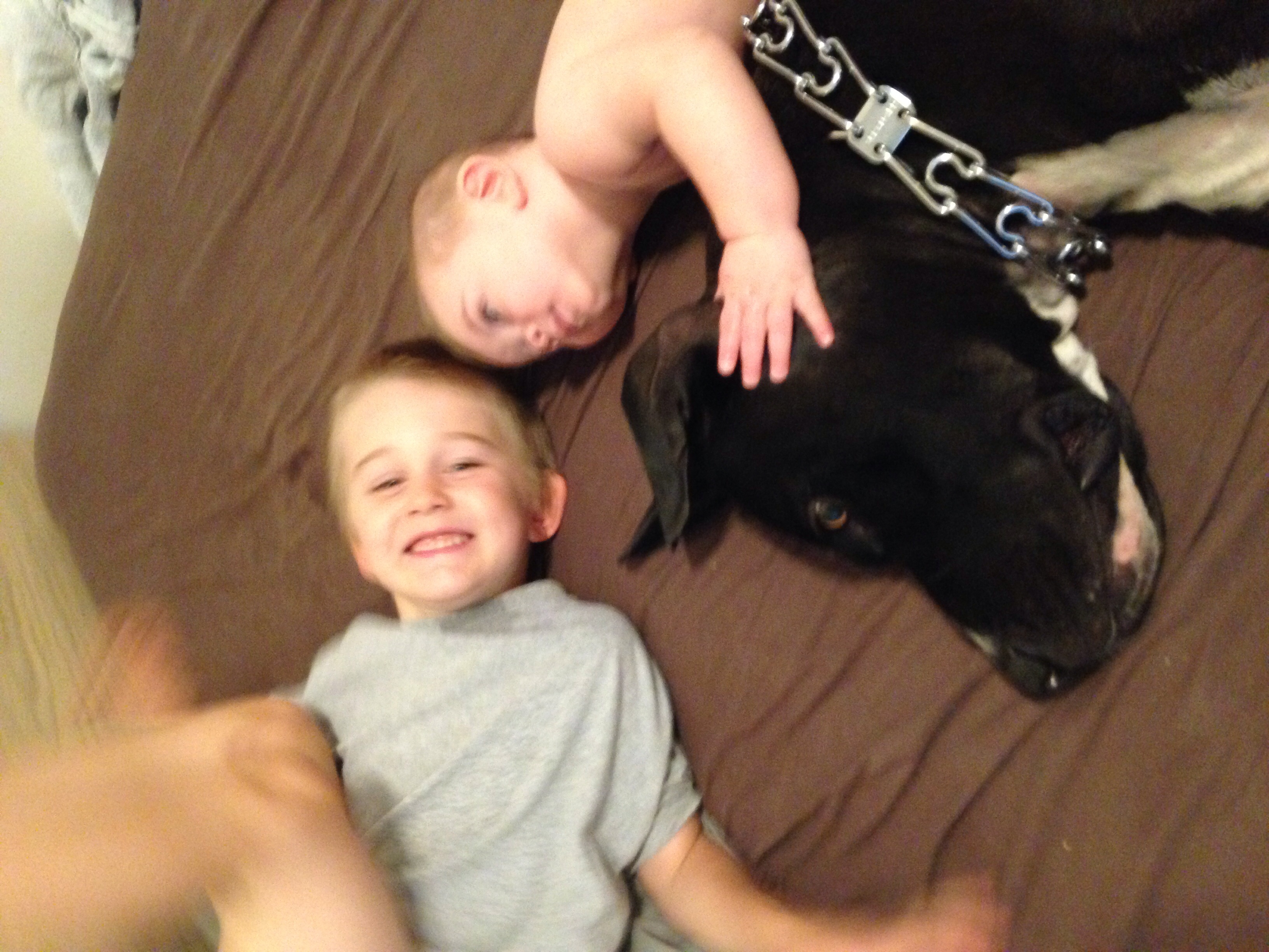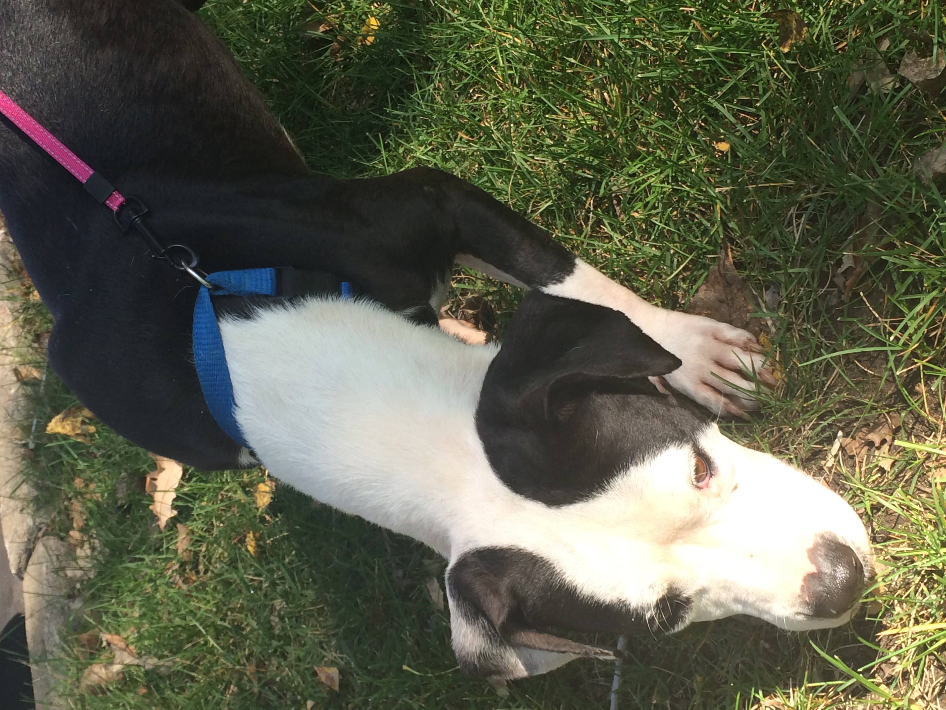The boxer/retriever is Lucie and the little one is Ricky