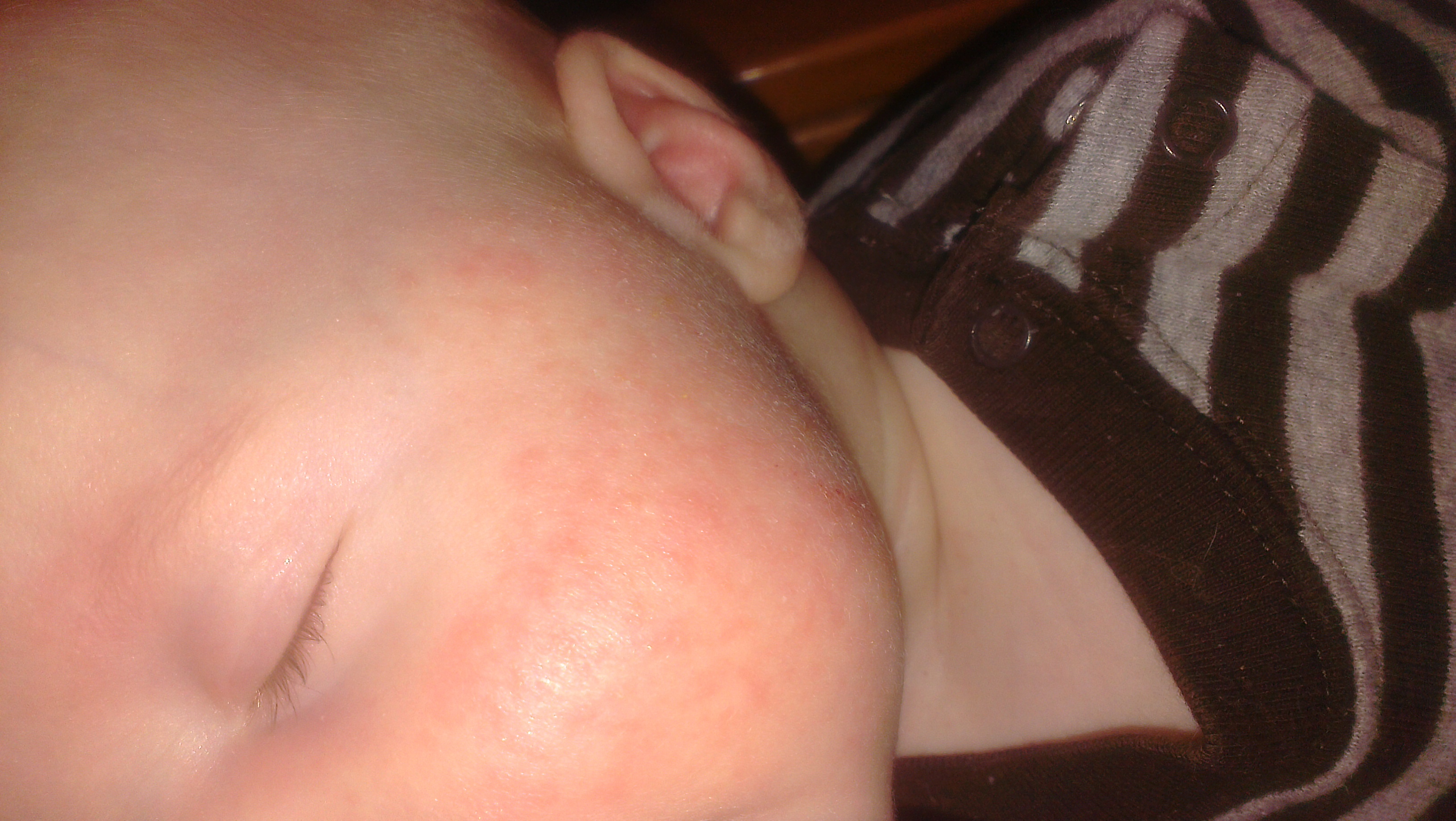 N still has some cradle cap left, but what concerns me most is a red, scaly rash on his cheek. It covers his one cheek and there are spots on his other cheek and small spots that come and go on his chest and once on his elbow. I tried to attach a picture. It's more red in real life, but the flash kind of washed it out.