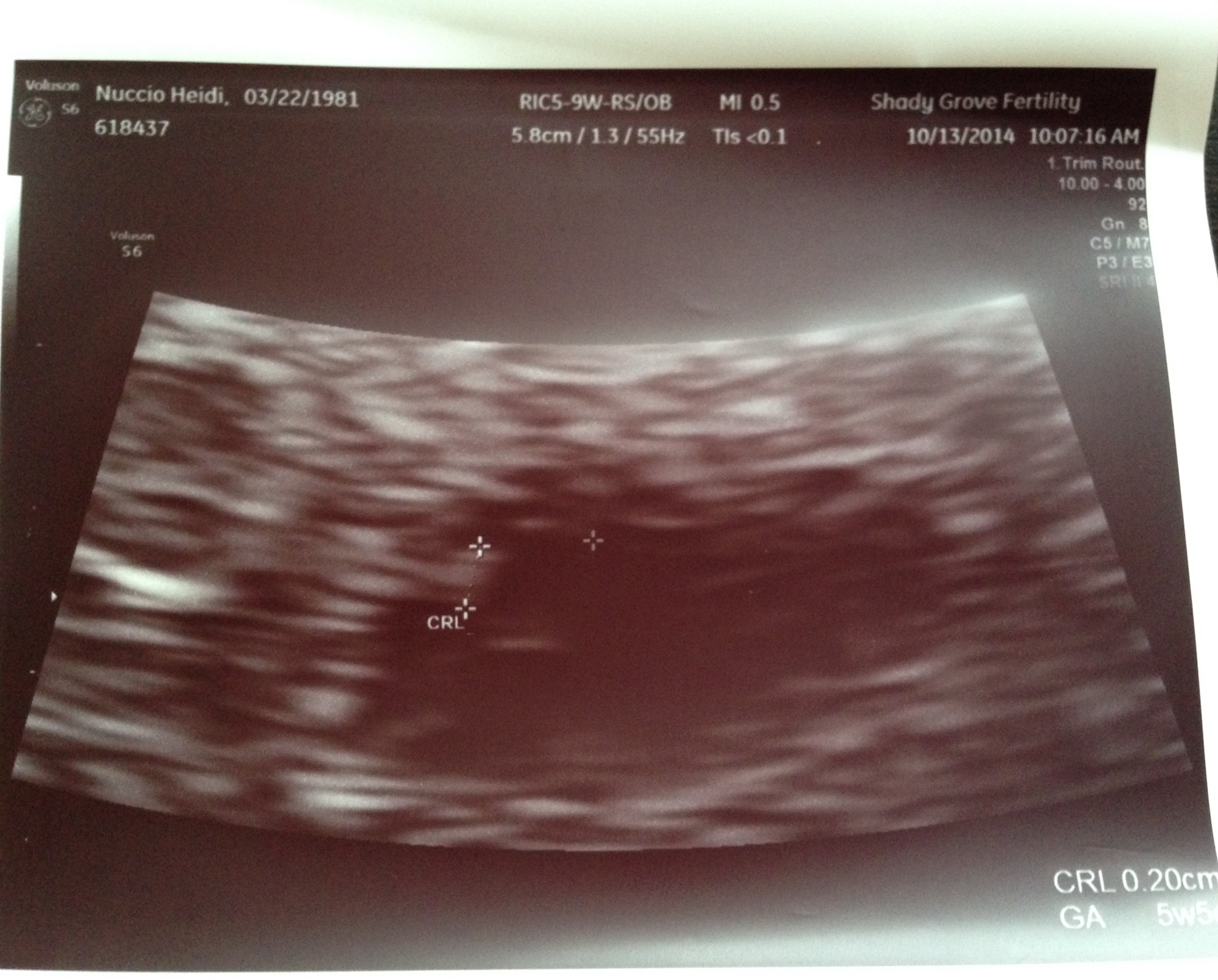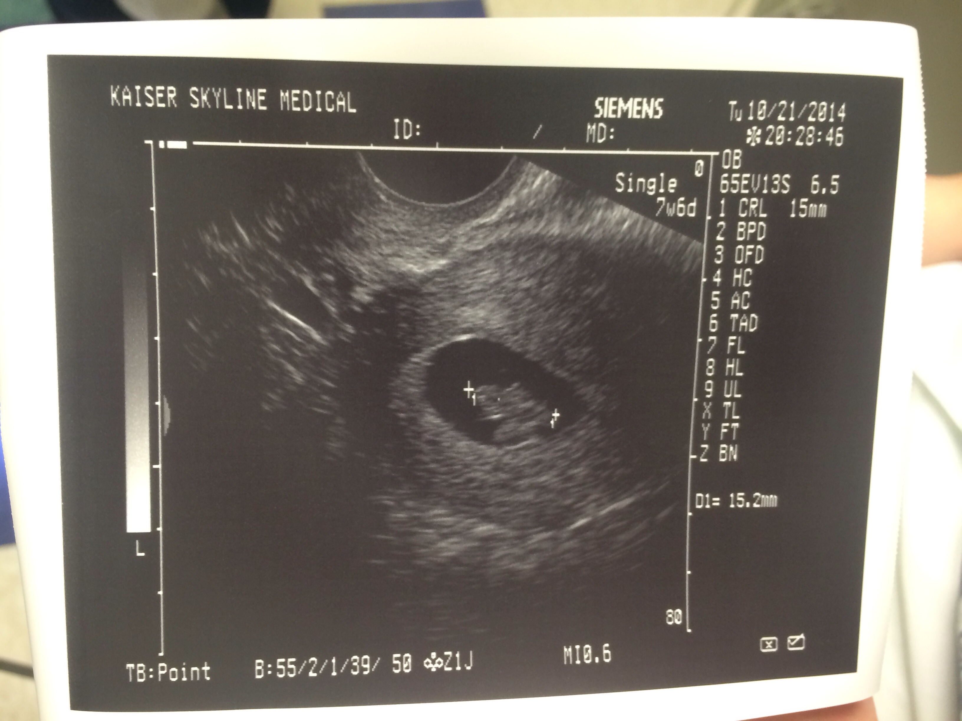 This is mine, went in 10-22 for an 8 week appointment (Kaiser Permanente insurance) turned out to be 7 weeks so I have to go back in for an "official" US on 11-3, but they still gave me a printout of my little McNugget! Seeing the heartbeat on the screen was my light bulb; I suffer from a chronic illness that makes me experience constant nausea, stomach pain and exhaustion (basically preggo without the fun prize in 9 months) so I didn't "feel" pregnant. Watching that flutter, it finally sank in.