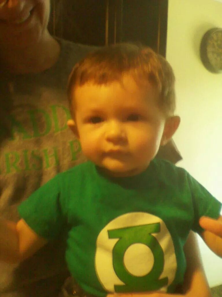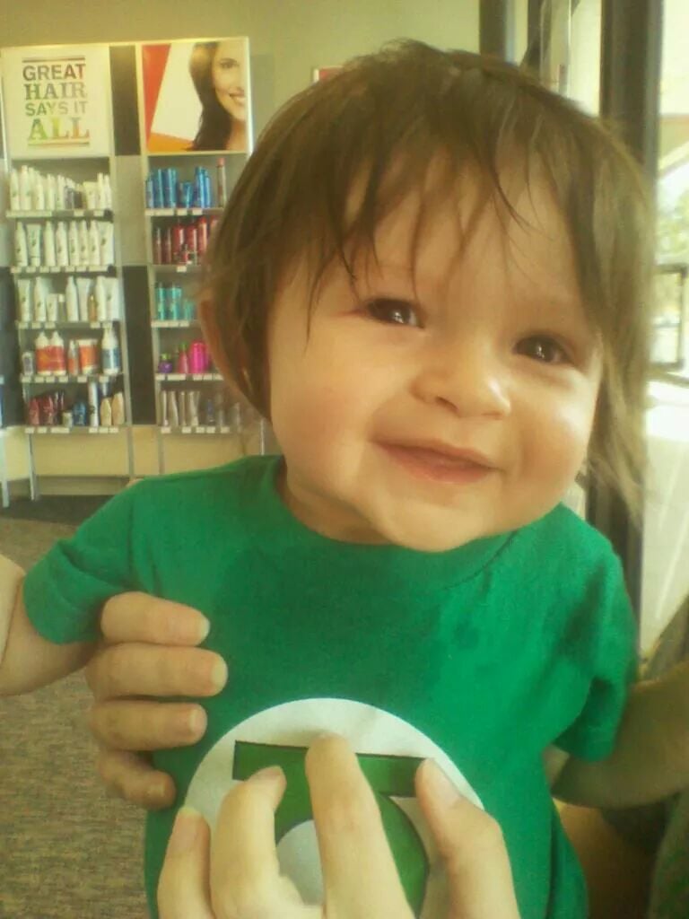 I brought a picture to the game! Lately I've been thinking about how long Rosalyn's hair will be by the time she's DS's age (2). Here's a picture of DS at 7 months old before and after his first haircut. I attached the after just to show what a haircut can do. He looks so much older in the second picture.