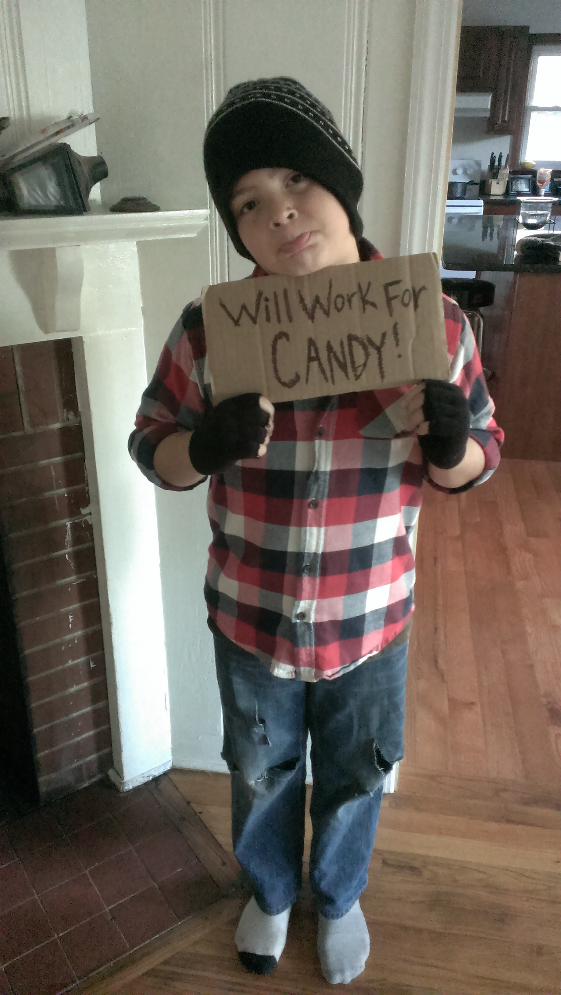 I didn't buy my DS one either if it makes u feel better!! He's wearing a flannel, ripped jeans (since what boy doesn't already own ripped jeans) and some other odds and ends. He is going as a homeless boy...