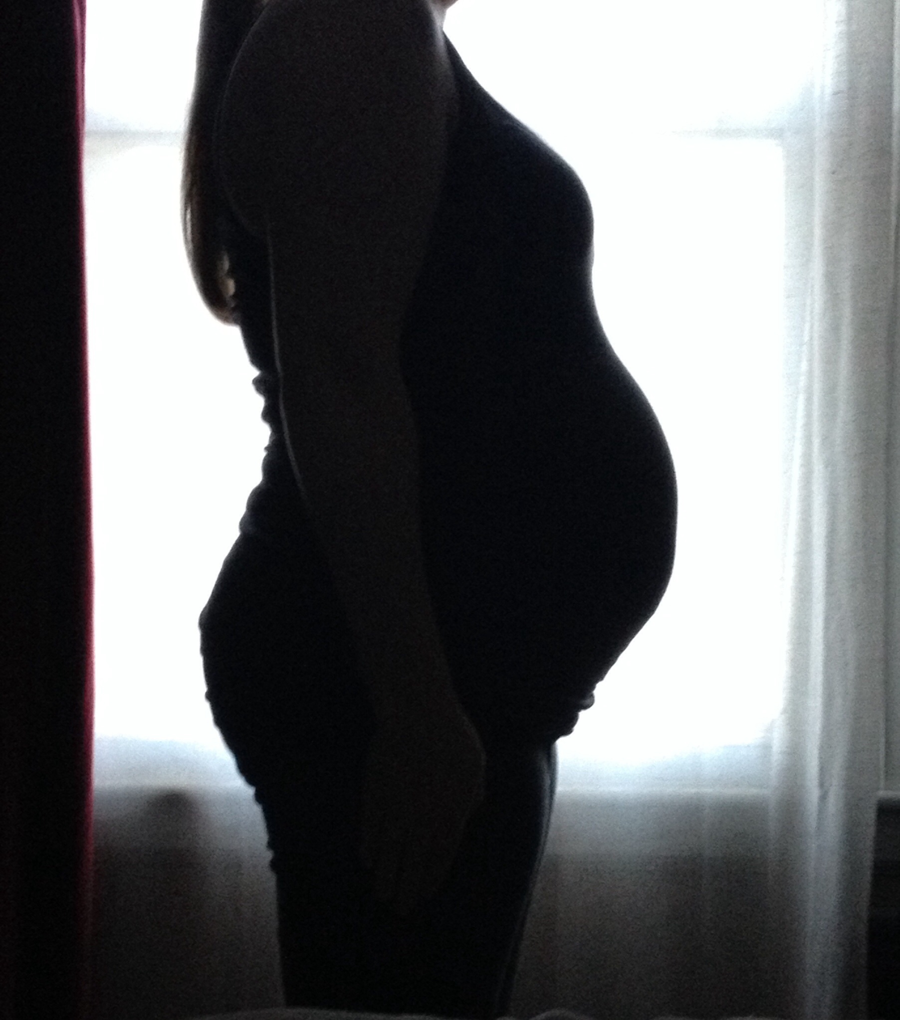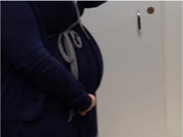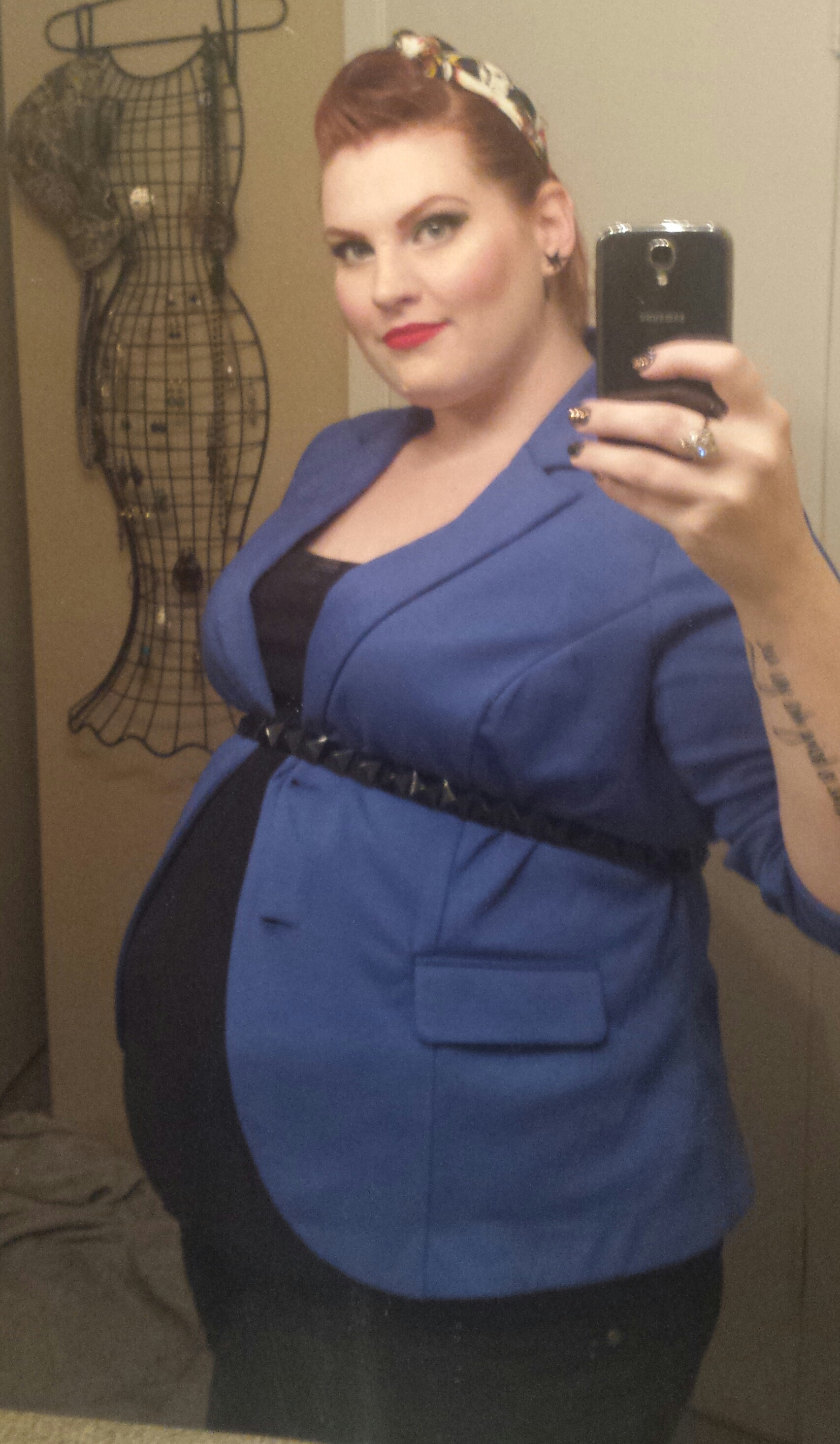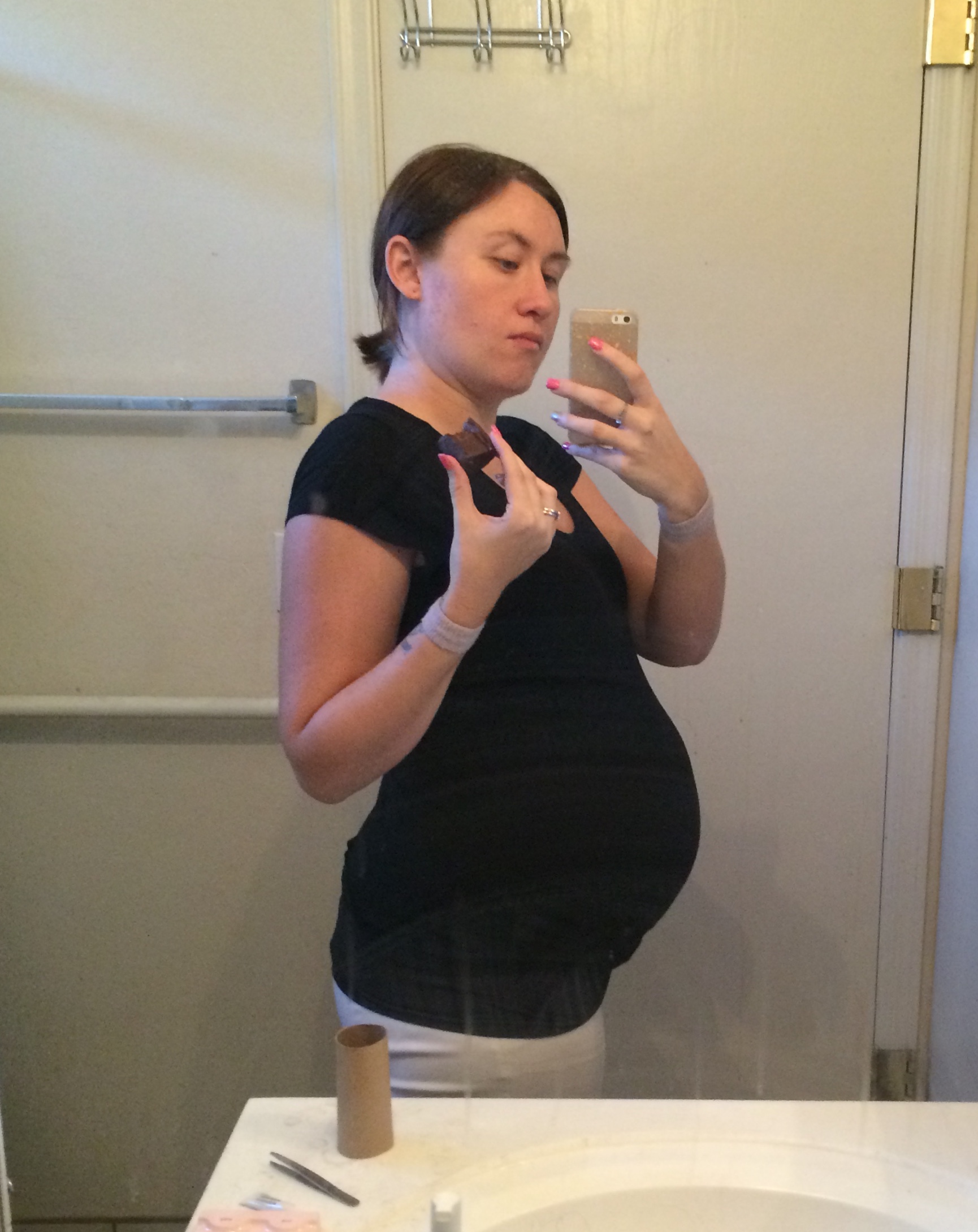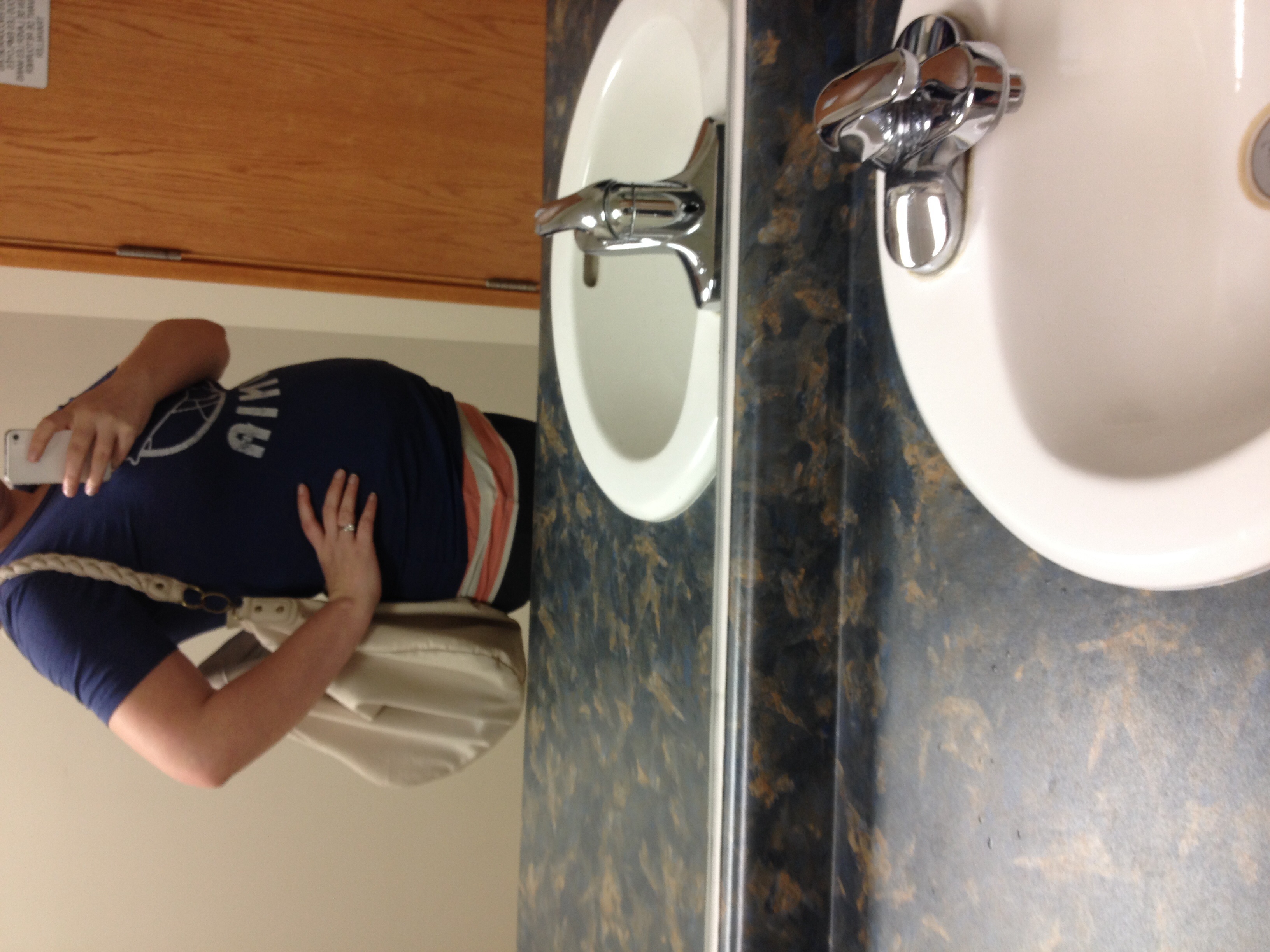 Hi Ladies! I promise I will be love titting everyone later, but for now work has me running like crazy. Here are Madeline and I at 27w2d and feeling pretty large now! I avoided getting my head in this shot because I don't like my hair today.