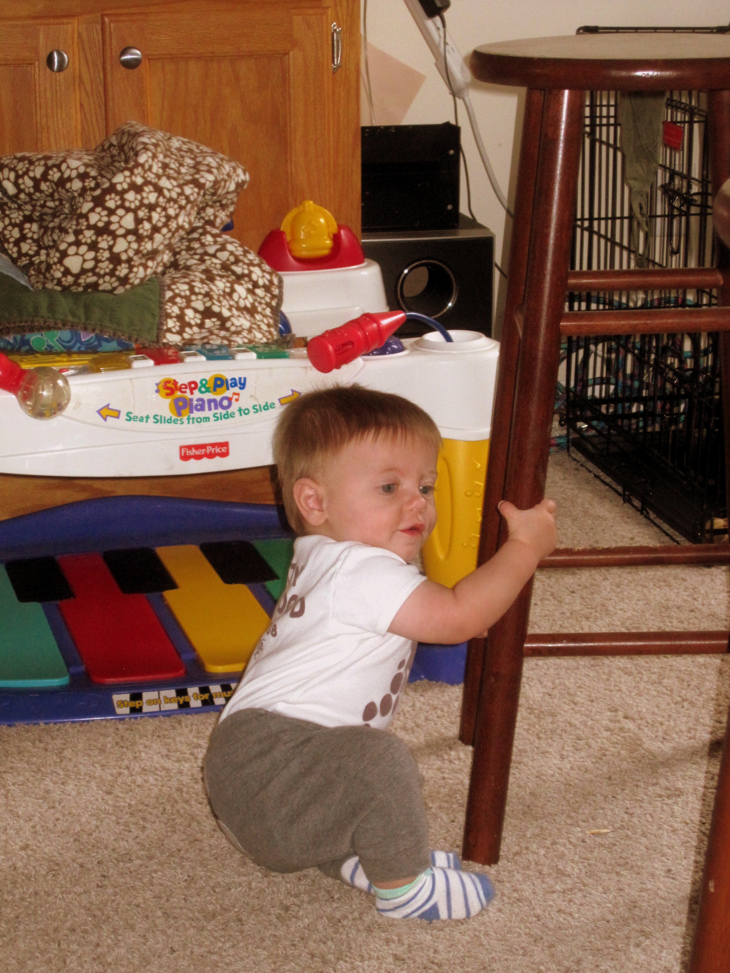 So, the pulling-up has begun. Currently his favorite place to attempt this new skill is the stool in the picture. Unfortunately, the stools are light enough that he pulls them around and could pull them down on him instead of pulling himself up. Is there any way to baby-proof that or do I just need to remove them?