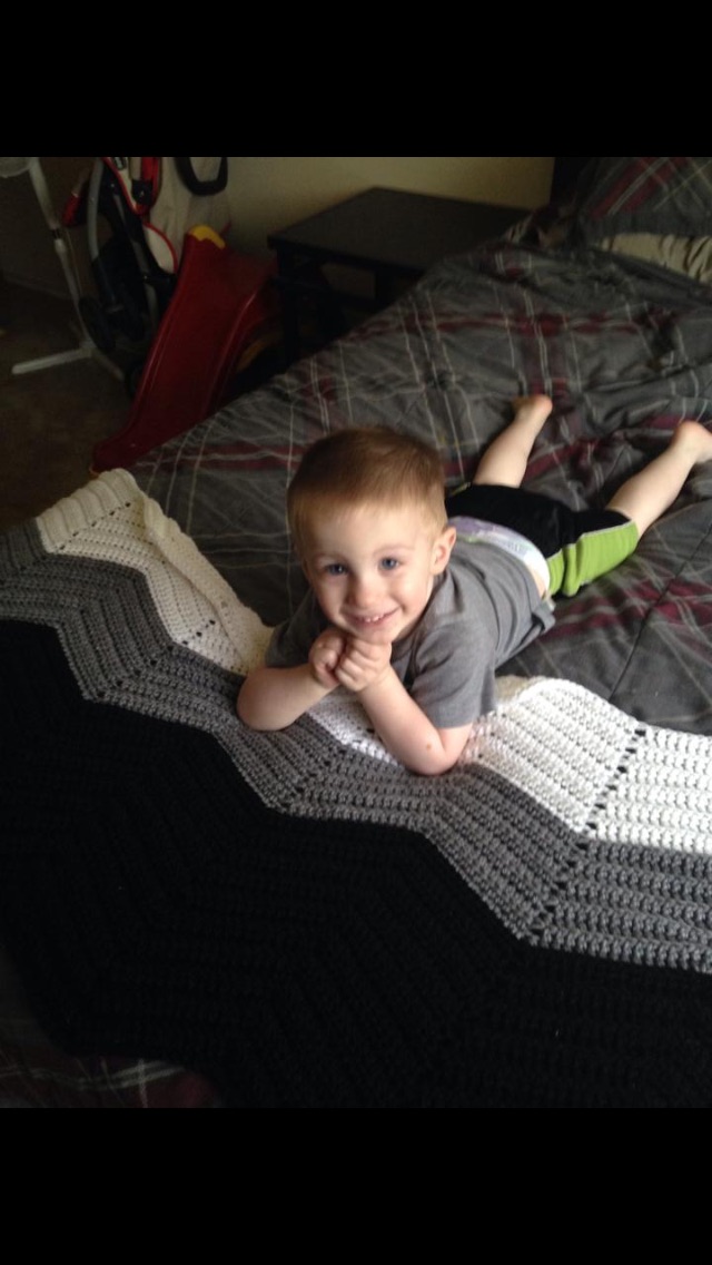 These are some hats I made for some special little girls for Halloween. And a black, gray, and white chevron afghan modeled by my DS. It isn't finished yet.
