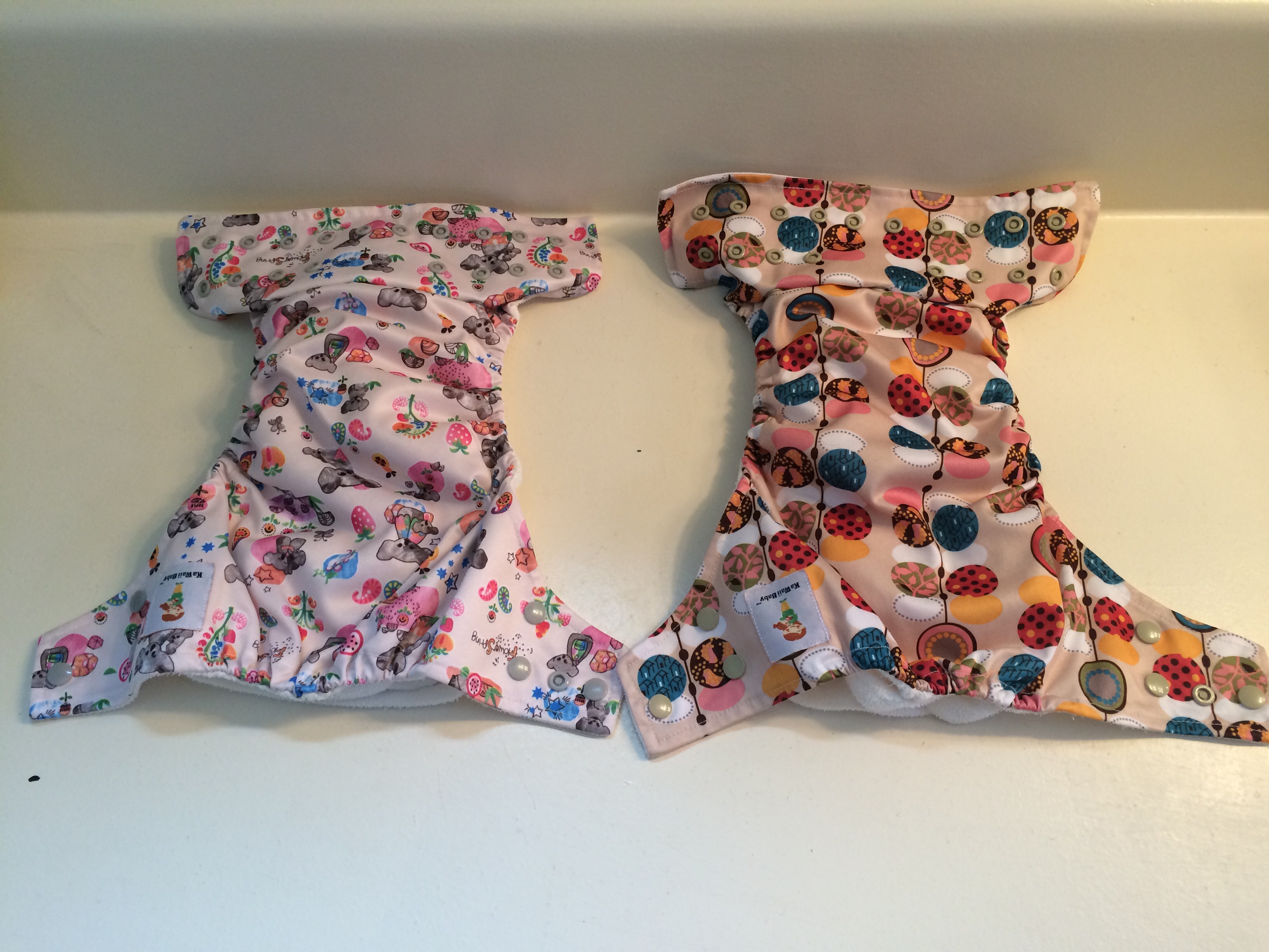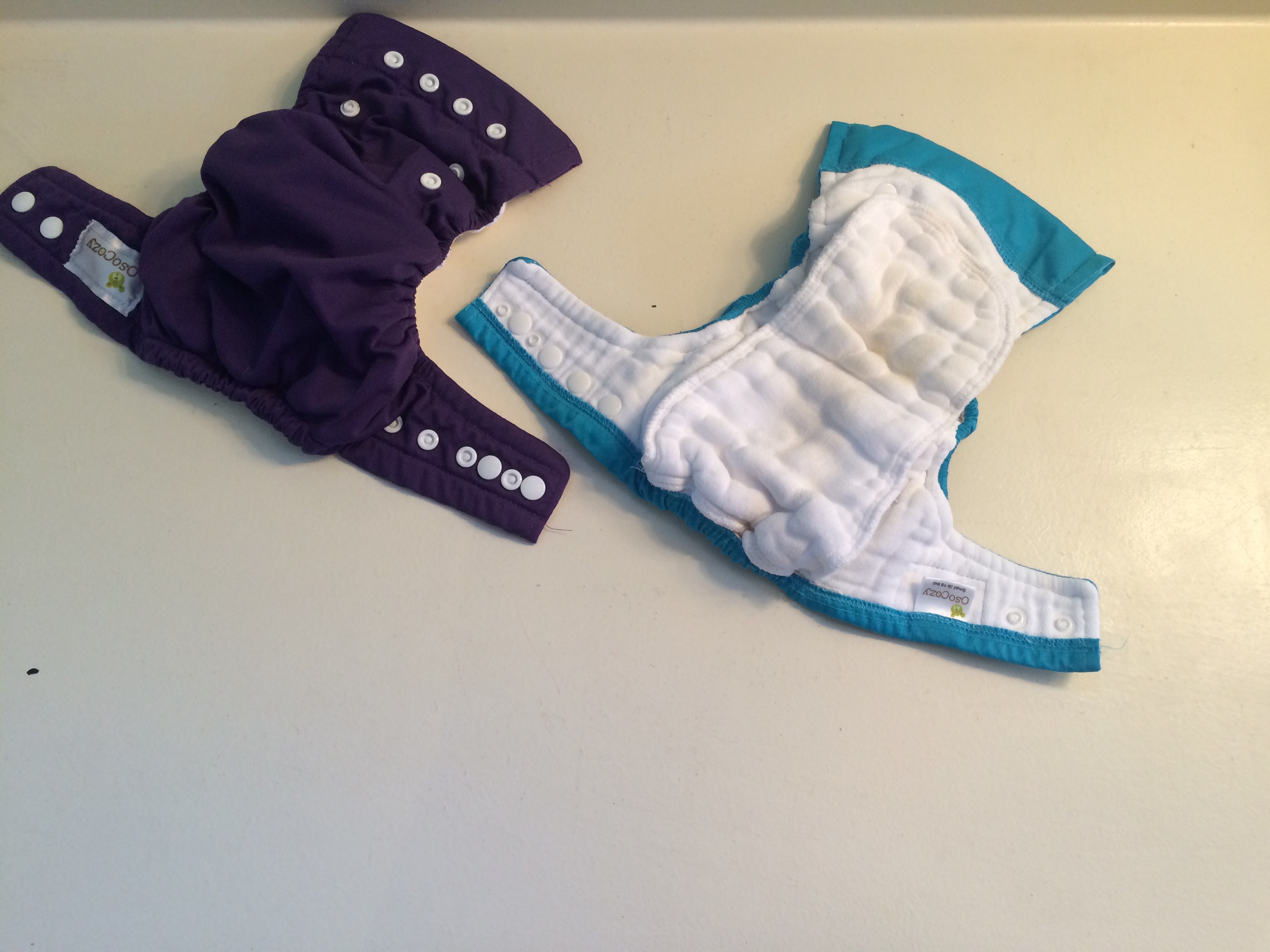 2 osocozy aio small (6-18 lbs I think. These fit very quickly!) in purple and turquoise with snaps. VGUC. One has slight staining- just no sun to get it out here.