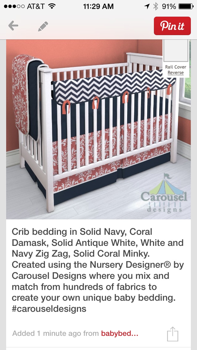 We are doing navy, coral and white for our little girl. White crib and changing table from Target. Then I want to paint an old dresser coral. Bedding from Carousel Designs. Love that you can create custom bedding on their website.