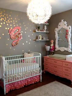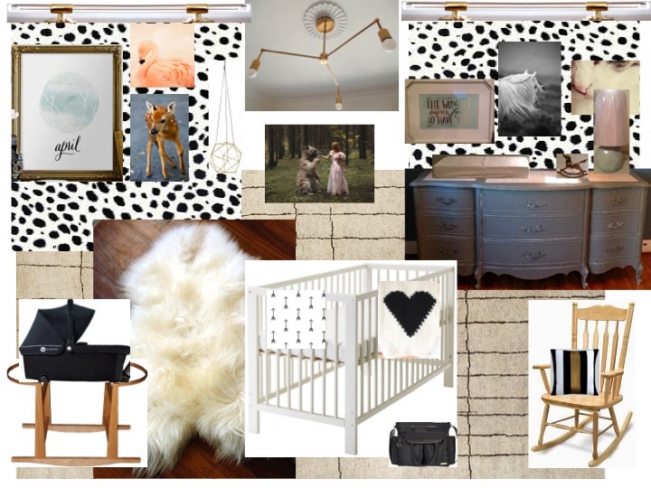 I'm doing mostly white with light links and gold accents. The crib and dresser are white from pottery barn and should be here Thursday! The glider and ottoman is a light pink I bought off amazon that should also be here Thursday. I did one accent wall in gold dots, and plan to find an antique gold looking mirror and frames to put on the wall. I kind of have an animal theme going too, as I found a plush pink lion and giraffe I bought from RH, and then found a pink elephant with gold dots from etsy that will match my wall.