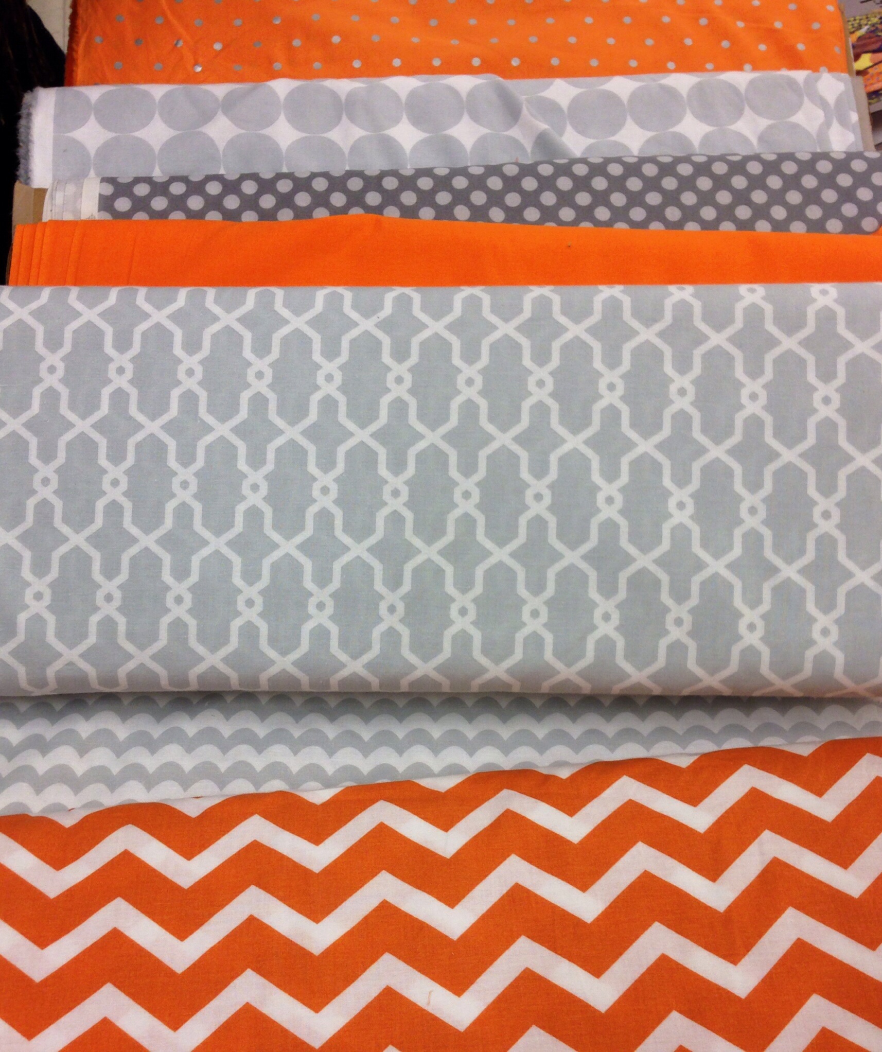 I love seeing all of these nursery ideas! We are doing an orange-grey-white nursery. Lots of modern patterns but no theme aside from the colors. White furniture with 2 grey walls and two walls with huge orange and white alternating horizontal stripes. My wonderful mother is sewing all of our nursery set for us and she's nearly done already! I'm anxious to get the room set up but we're in the middle of some major home remodeling so the nursery has to wait. Below is nearly all of the fabrics we are using for the nursery. Still need a big rug though!