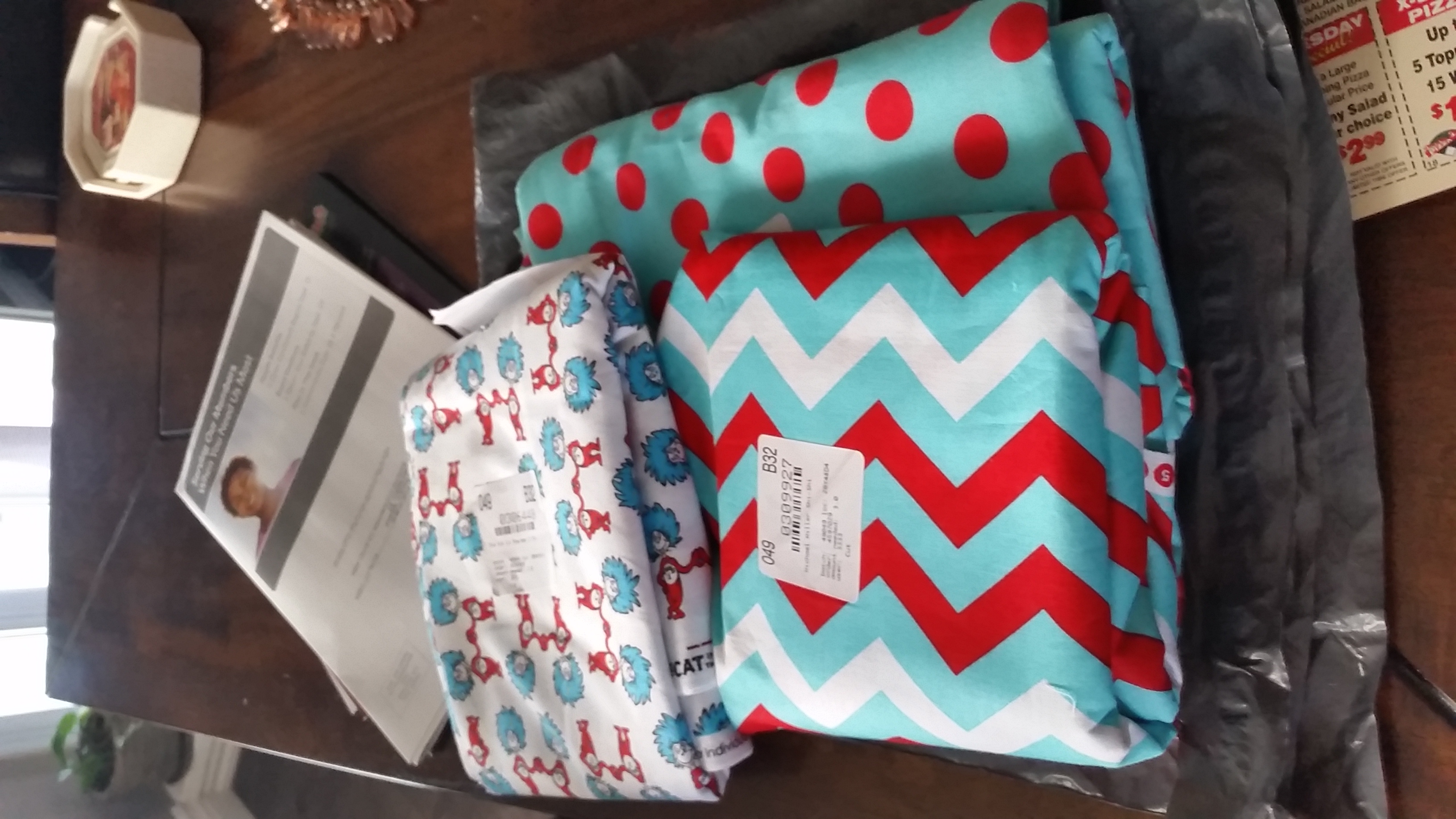 I've always loved Dr. Seuss, so our theme is a modified Dr. Seuss theme. The color scheme is red and turquoise. I've been making the bedding. When we moved into our house last year, we painted the room we hoped to be the nursery a light grey. We plan to do bead board around the room. Our furniture is a grayish white color. We had my grandmother's old dresser refinished and paint matched to the crib, and will double as a changing table. I will add in small Dr. Seuss character accents, such as the sheets and wall art. This is some of the fabric I am using.