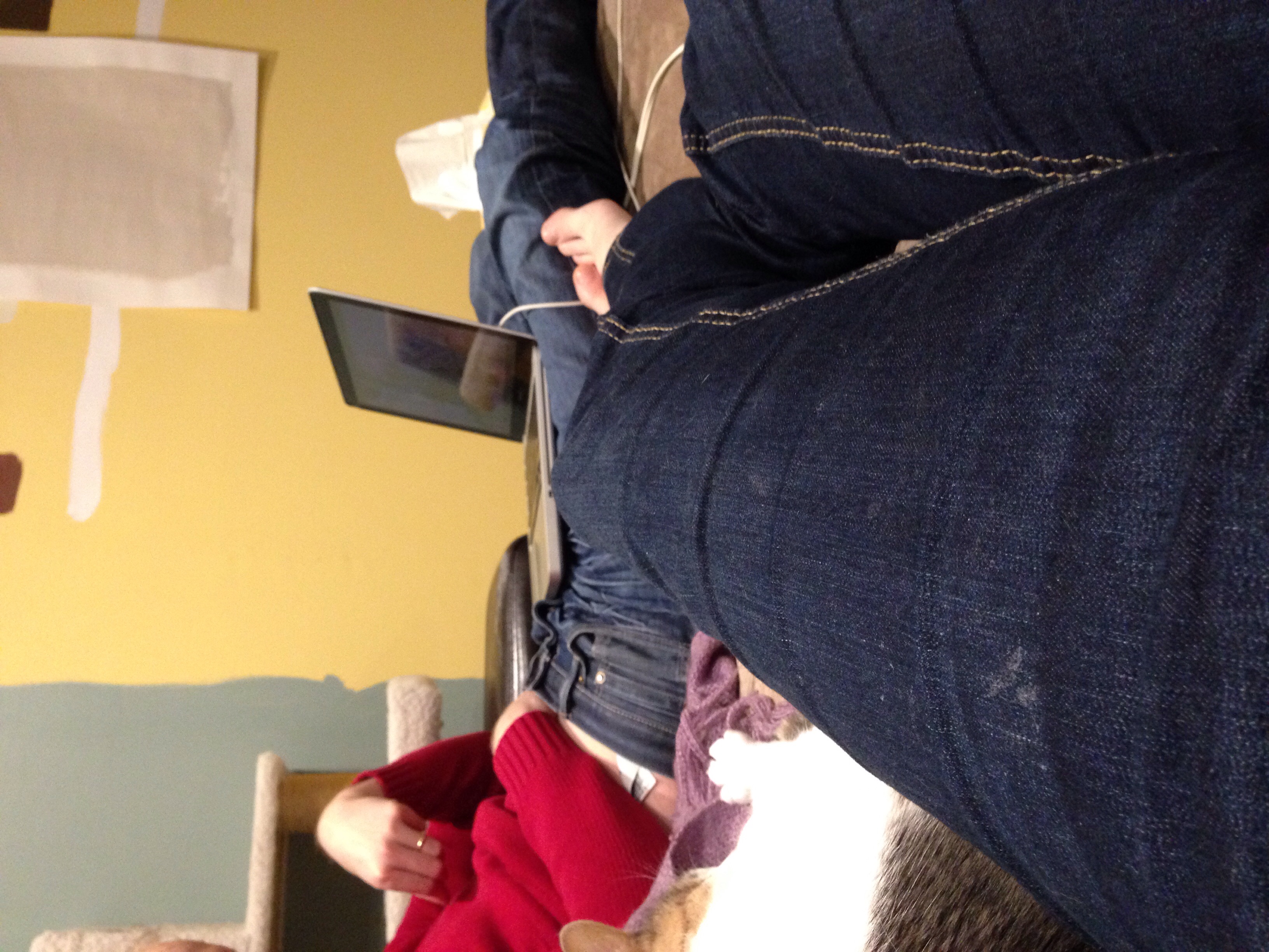• Cat, DH and I on couch, just hangin out after a little cleaning up this evening