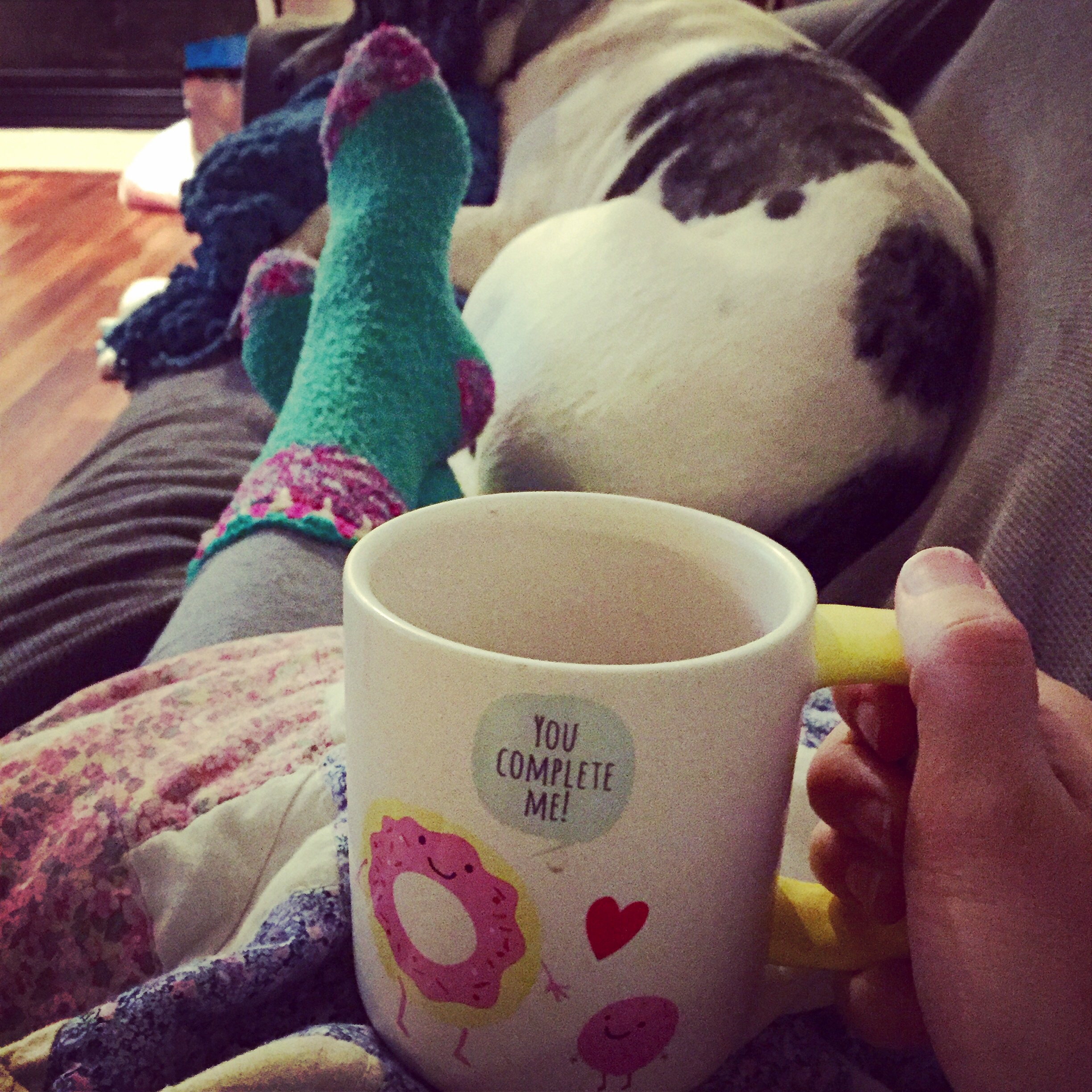 I'm currently nursing a terrible sore throat. How do you do that? With a hot cup of tea and honey, cute cozy socks, your grandmas handmade quilt, and the handsomest of pups of course.