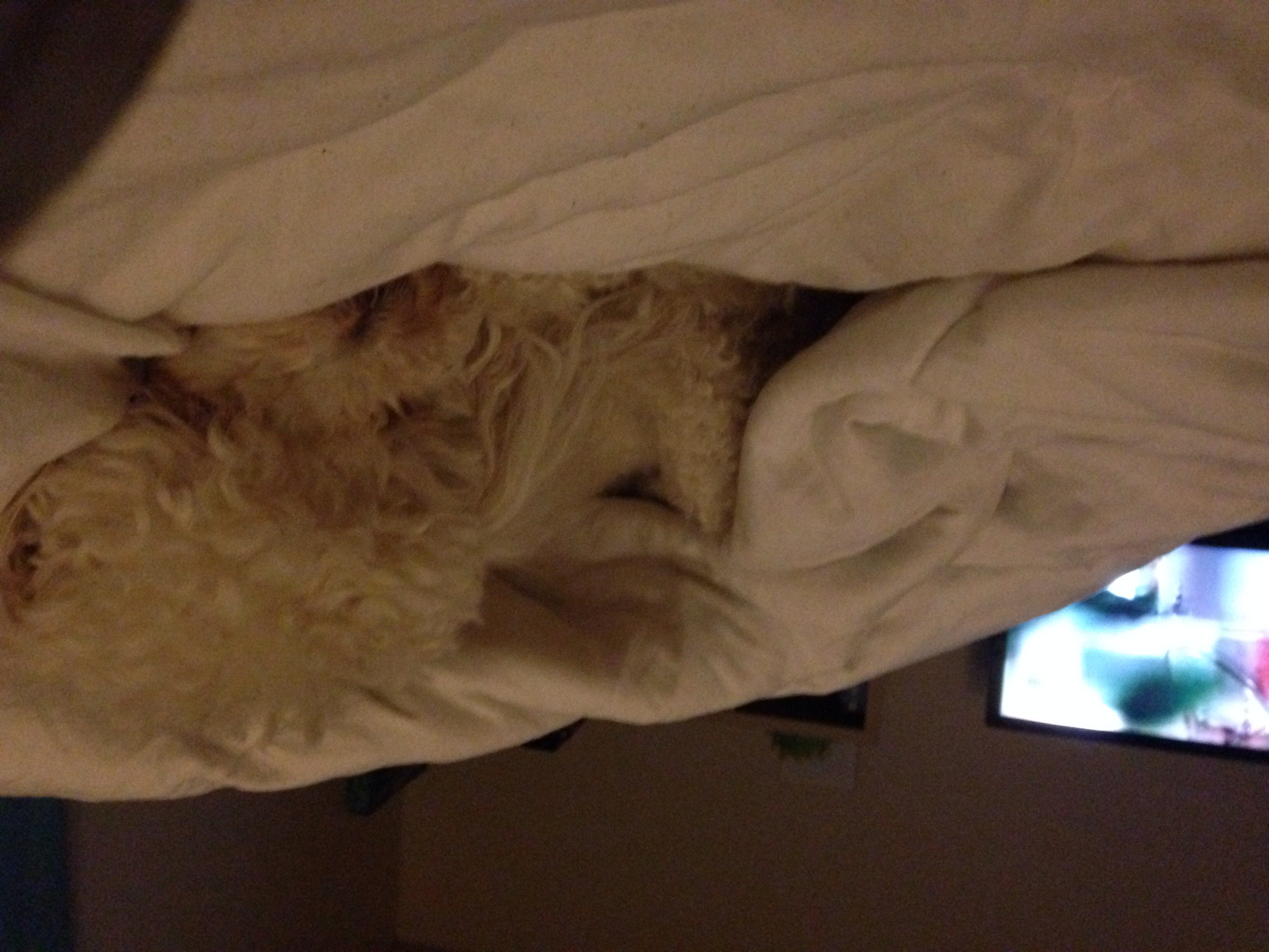 • I am snuggling post-scare with my doglet. I made a nest for him since it's unseasonably cold. And that's Criminal Minds on in the background. My sister is out getting me vegan ice cream and aloe socks.