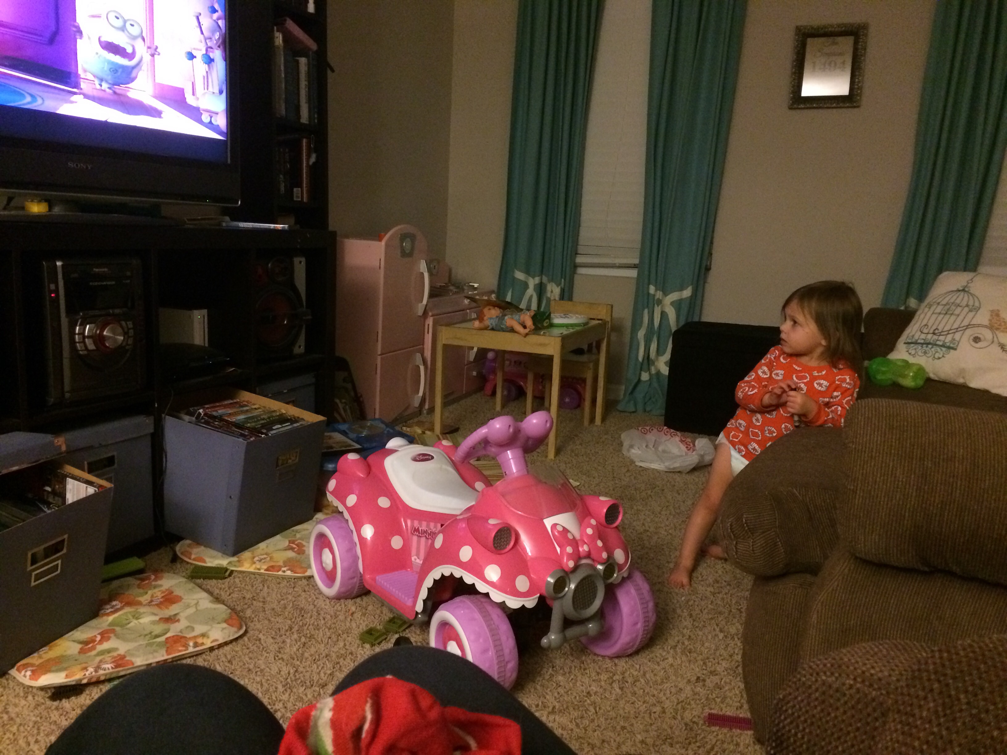 I'm staring at my horridly messy living room, watching despicable me 2, and my daughter is coloring. I'm waiting for DH to come home so I can leave, I have a girls night tonight!!
