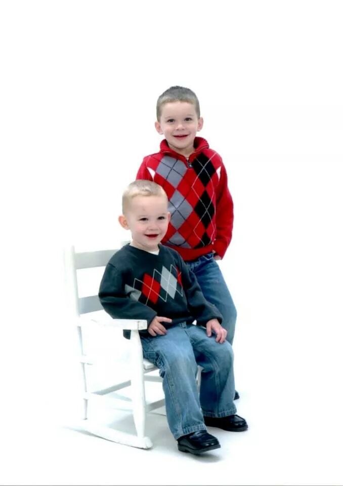 I took the boys for their holiday pictures. They did really well! And I'm proud of myself for walking out of Portrait Innovations only spending $49. They always get me with those packages and I feel stupid later because I'm stuck with a million pictures I don't need. All I got this time was the $19.99 one pose package and a side by side cameo of each of the boys to replace last year's.