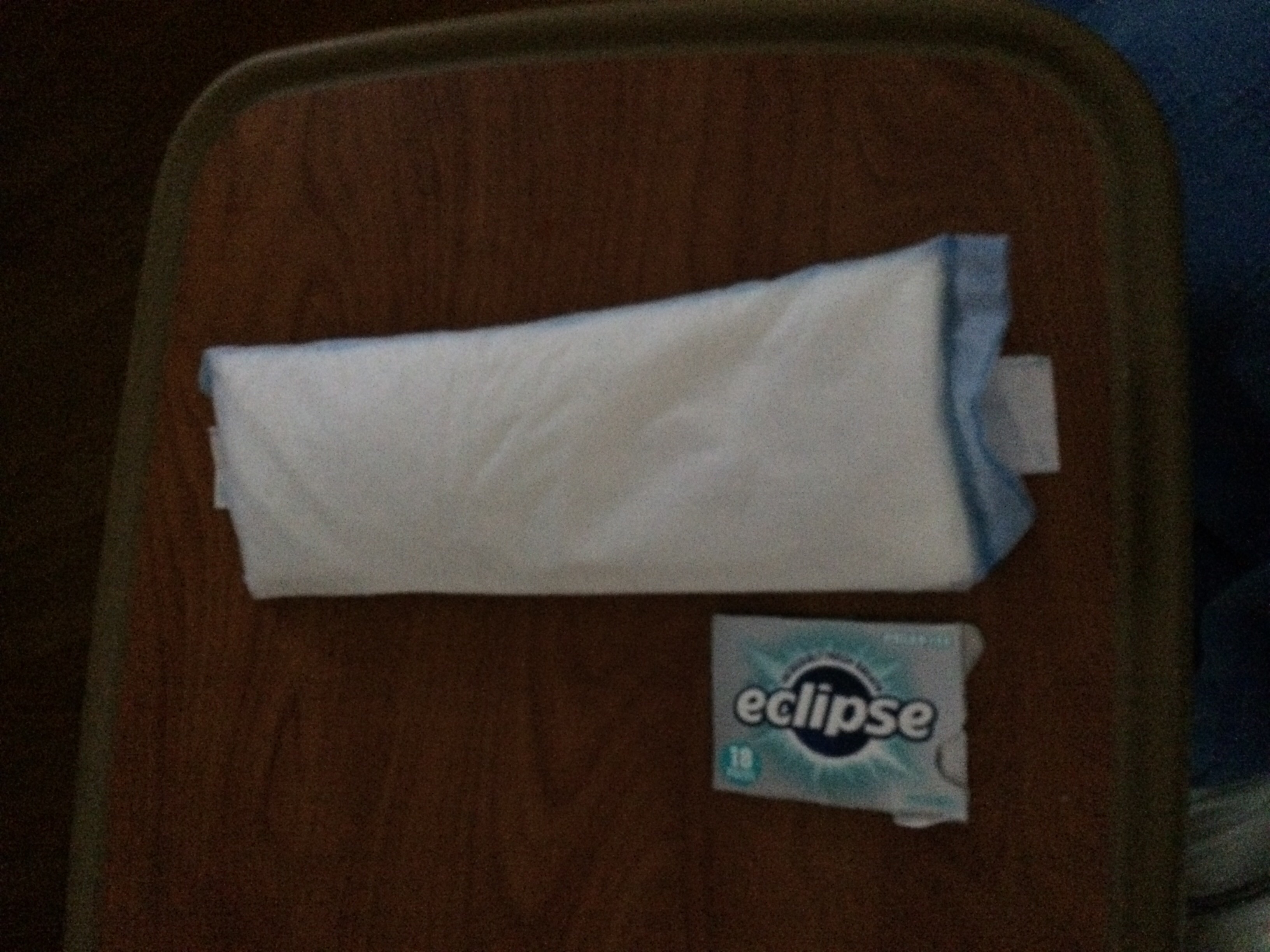 And for you FTM's, here's a shot of the maxi pad next to a 3 inch long pack of gum for scale. That will be your post delivery pad with a built in ice pack, tucked inside those mesh undies we've all heard so much about.
