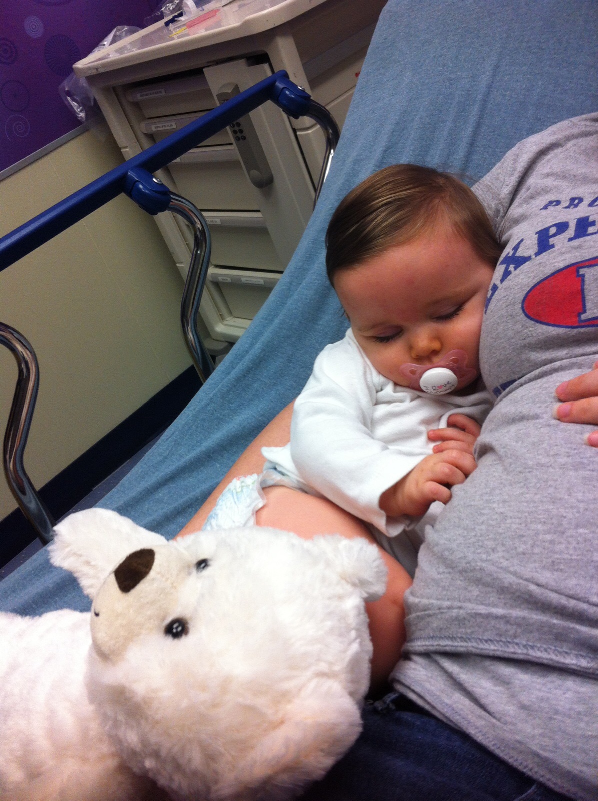 Here's her after all her tests at like 2 in the morning. She was not a happy camper. But she sure did charm everyone. She got a bear from the paramedics and the white bear from the ER nurses.
