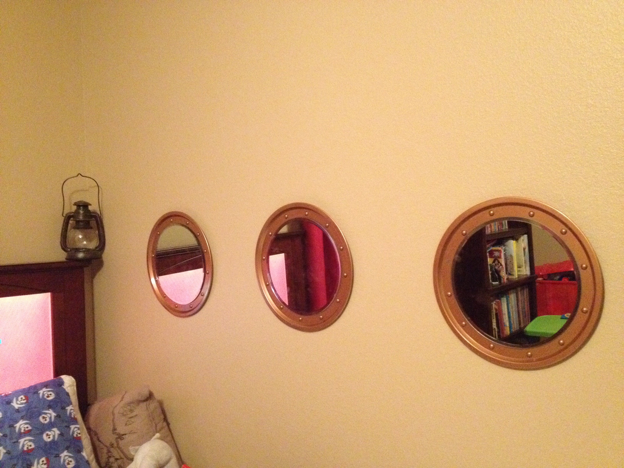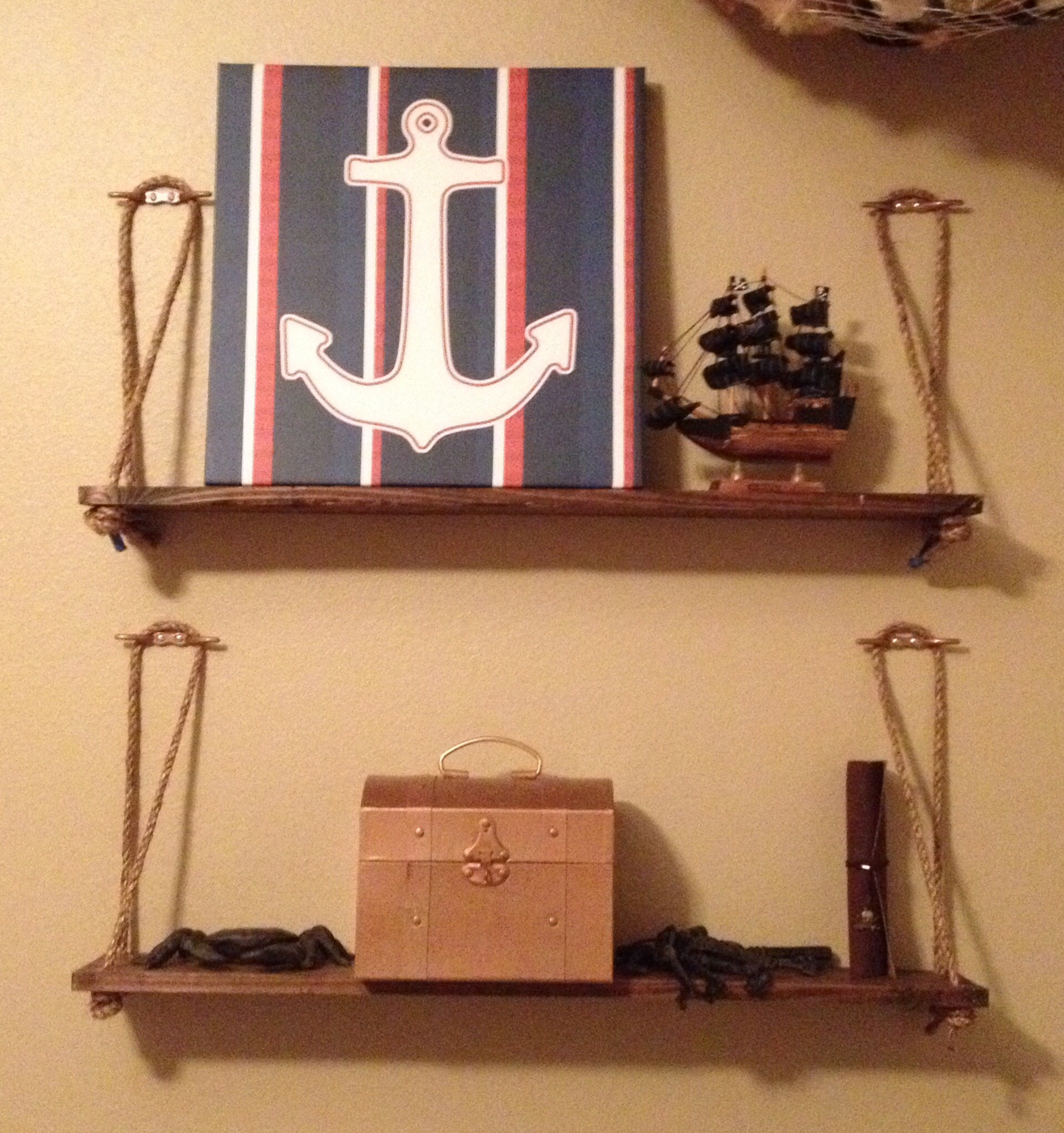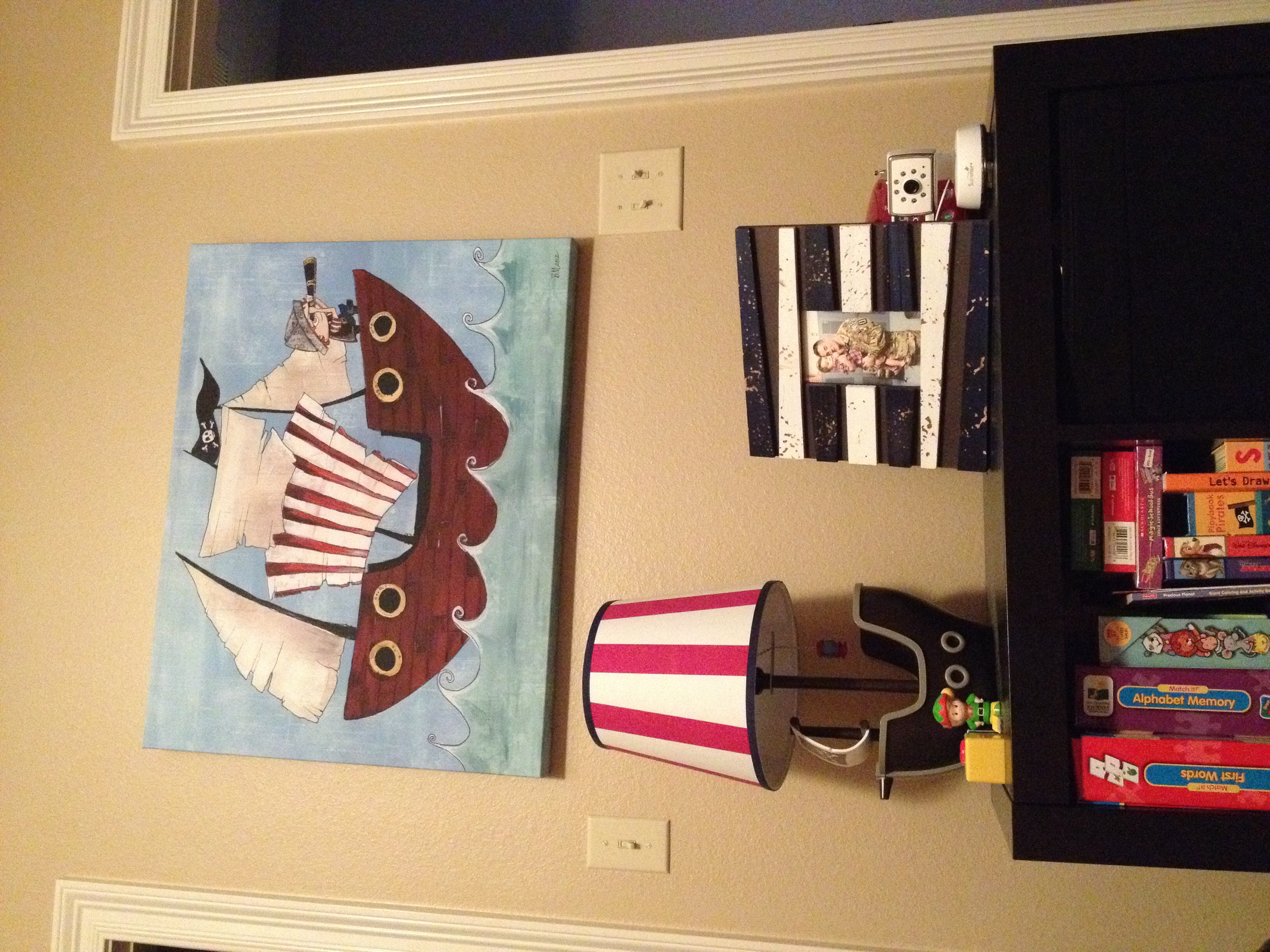 We have a pirate theme for my LO's room- we did porthole mirrors on the wall (DIY for super cheap) and shelves I made from stained wood and rope. I'll add pictures in a little bit! Hobby lobby has a ton of pirate/nautical theme things as well and you can shop online if you don't have one nearby.