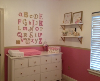 Just spent over an hour positioning and putting up the letter wall. H painted the walls for my Christmas present and is installing a chair rail (something he's never done, so we'll see how that goes!) where the tan stripe is on the wall. He's been a pretty good sport about hanging things and being my own personal handyman so I can't complain. The crib will be here Tuesday and I cannot wait to get it set up! I didn't get to do a nursery until LO was a few months old since we moved so I am having a ton of fun putting together a nursery pre-baby!