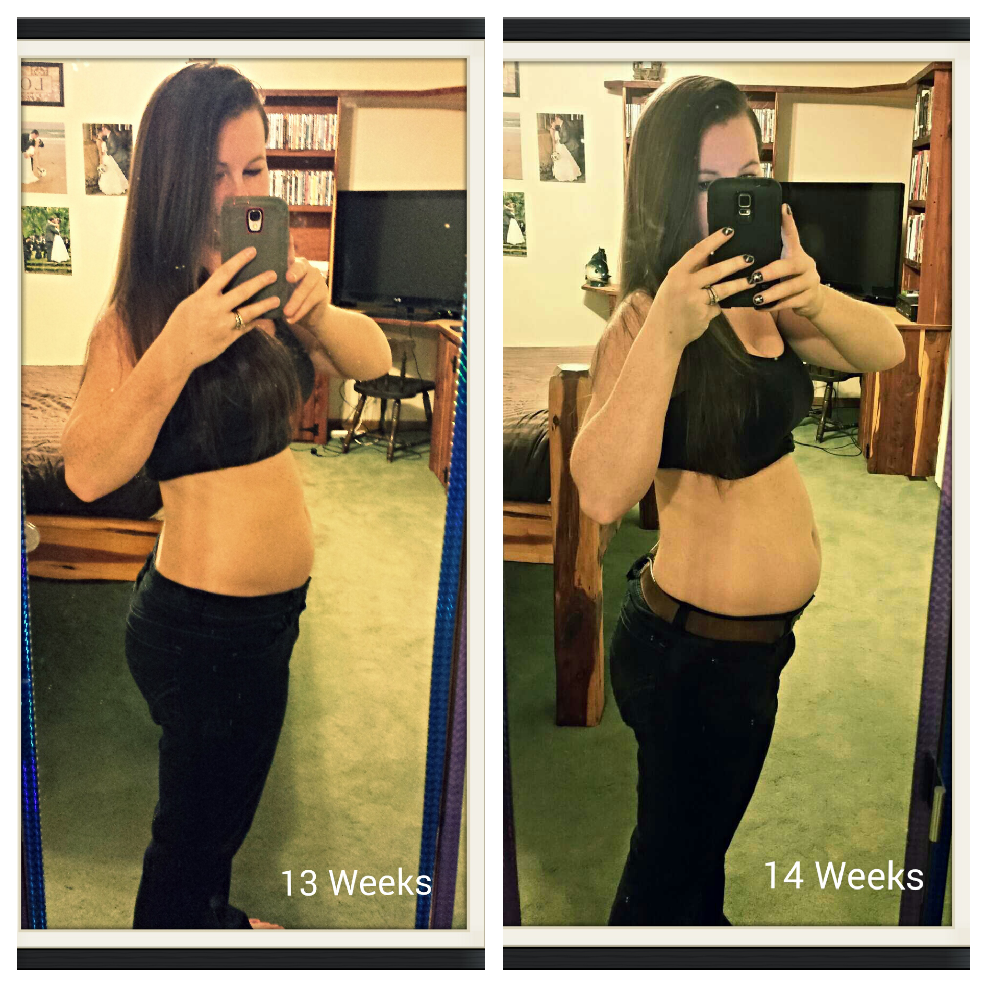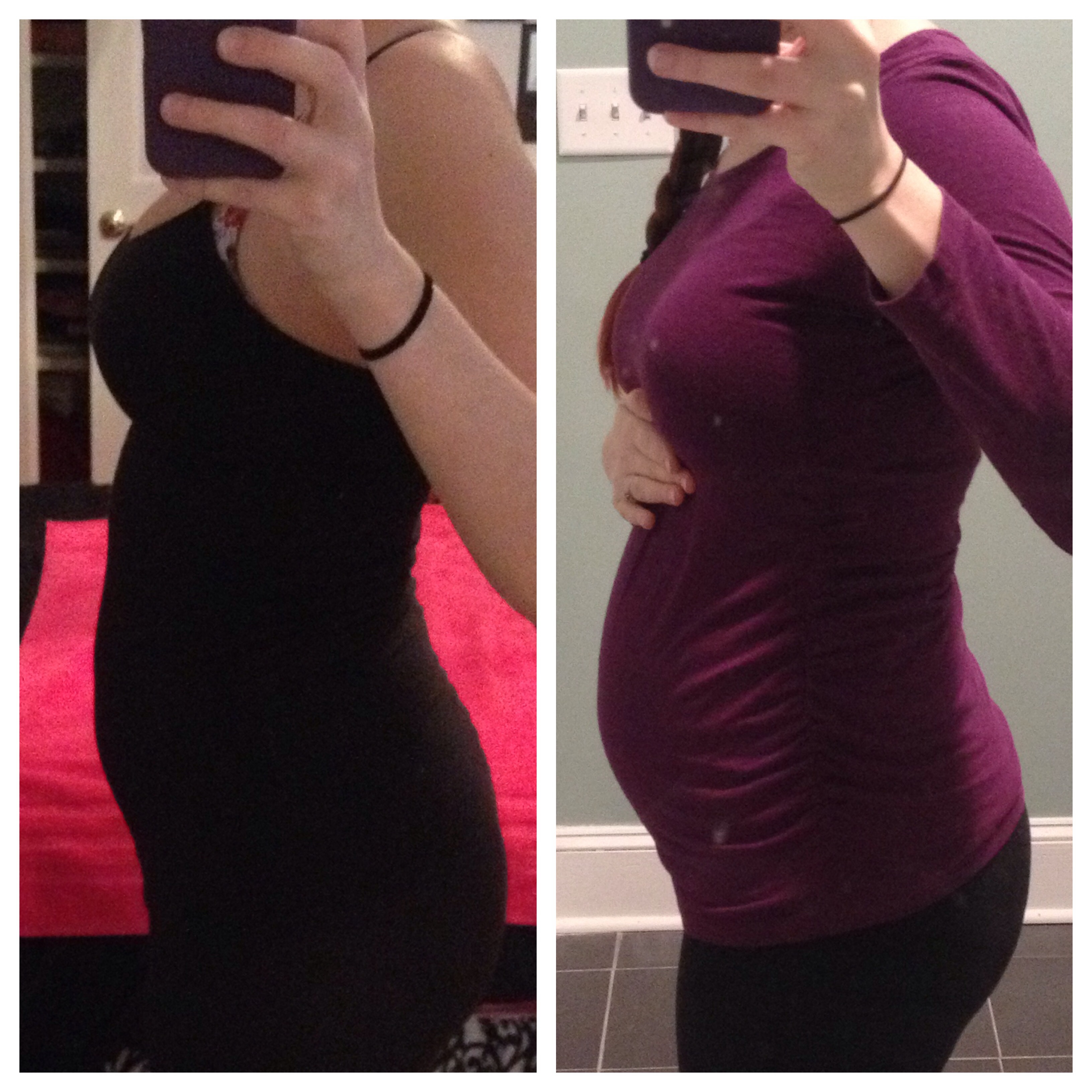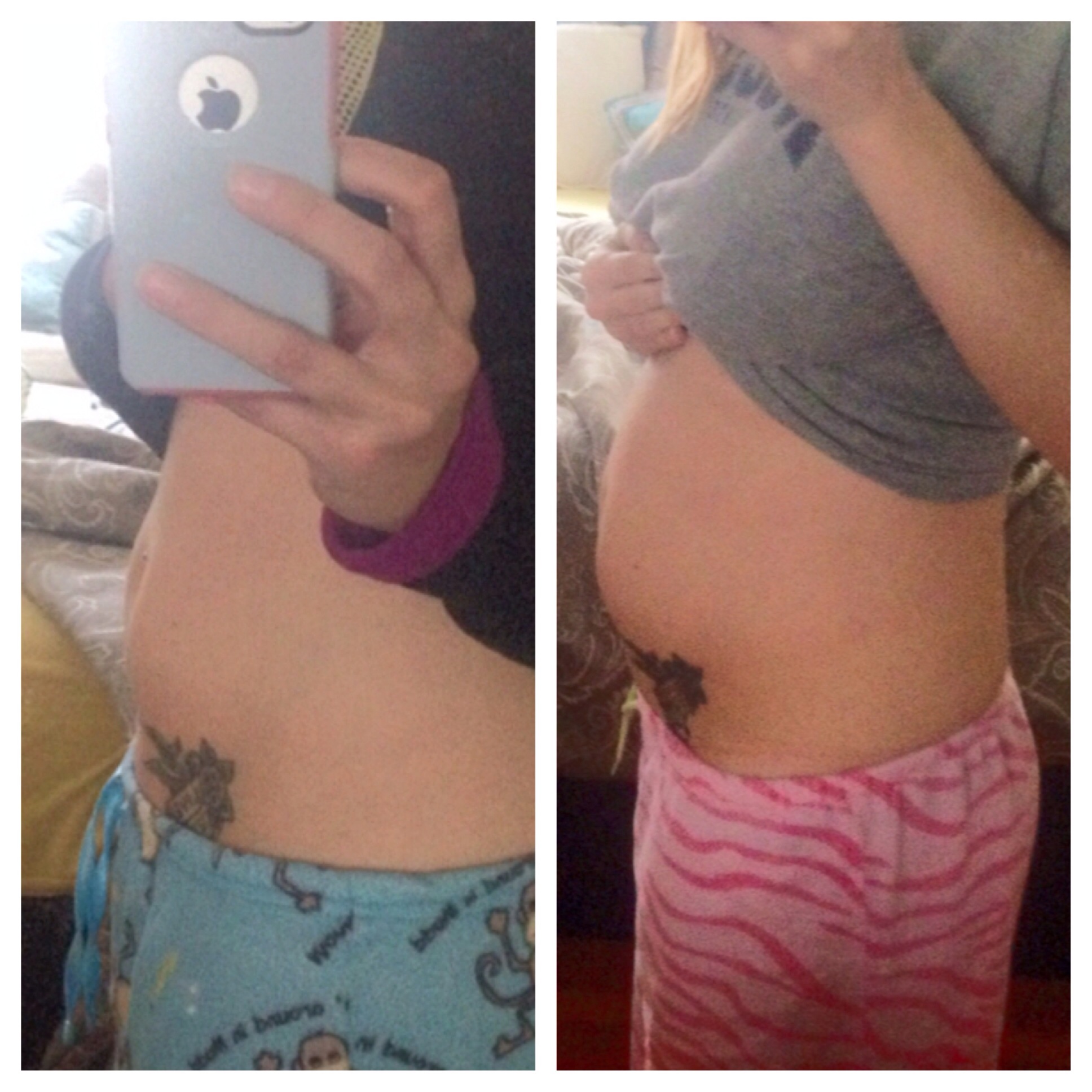 Left: 5wks Right: 15wks Sorry about the bare belly pics. I hear some people are weird about it but I've only taken bare belly photos so far. Also, I love funky pj bottoms )