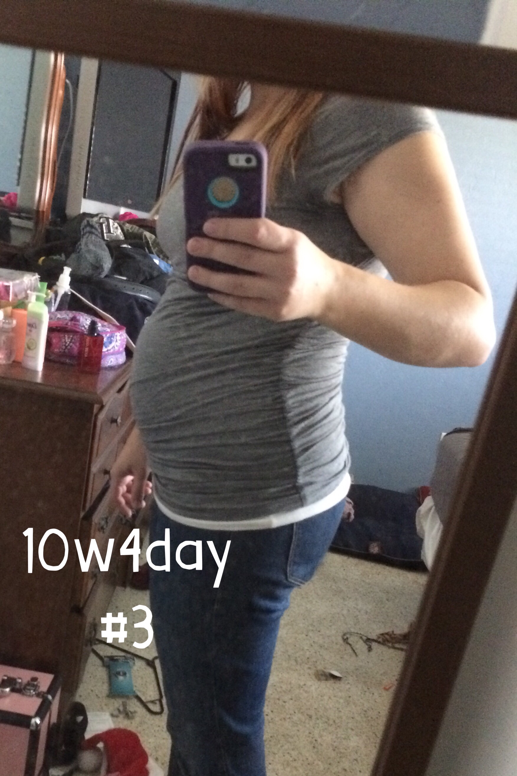 The blump definitely comes out to play in the evenings. Took this at 10.5 weeks (Pregnancy #2 -- after twins). Thinking the fact that I'm letting the cat outta the bag at work today is a good thing -- it's getting TOUGH to hide!