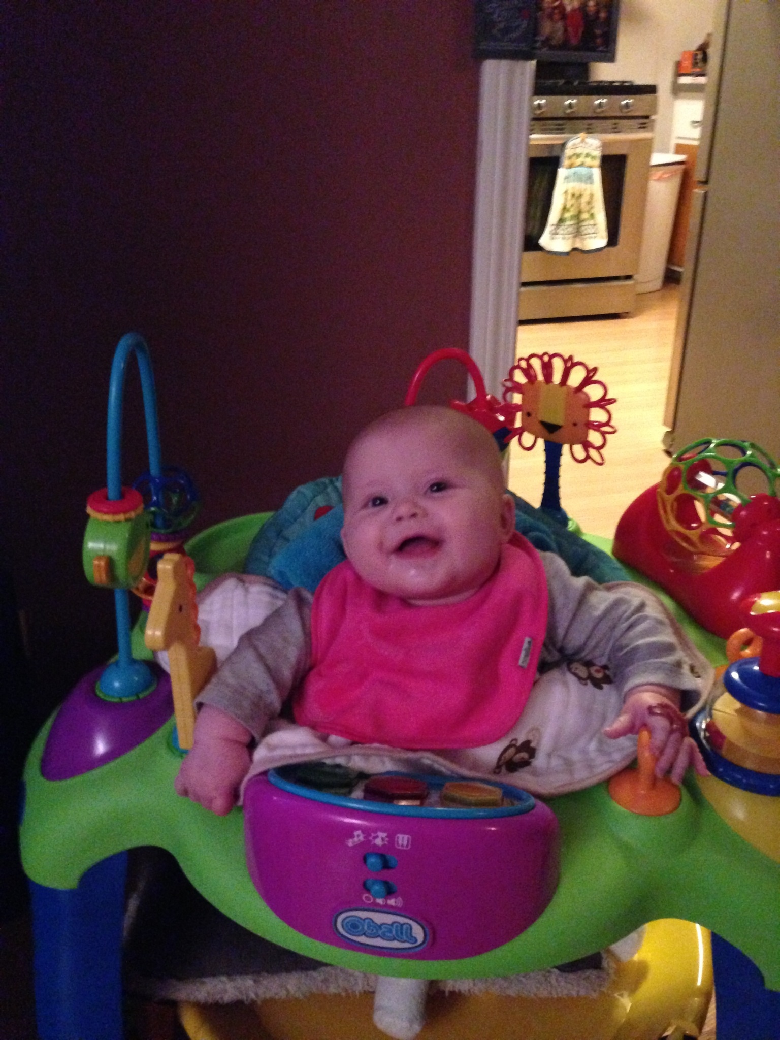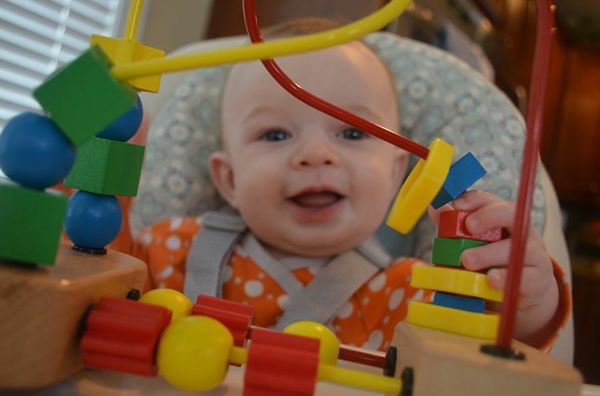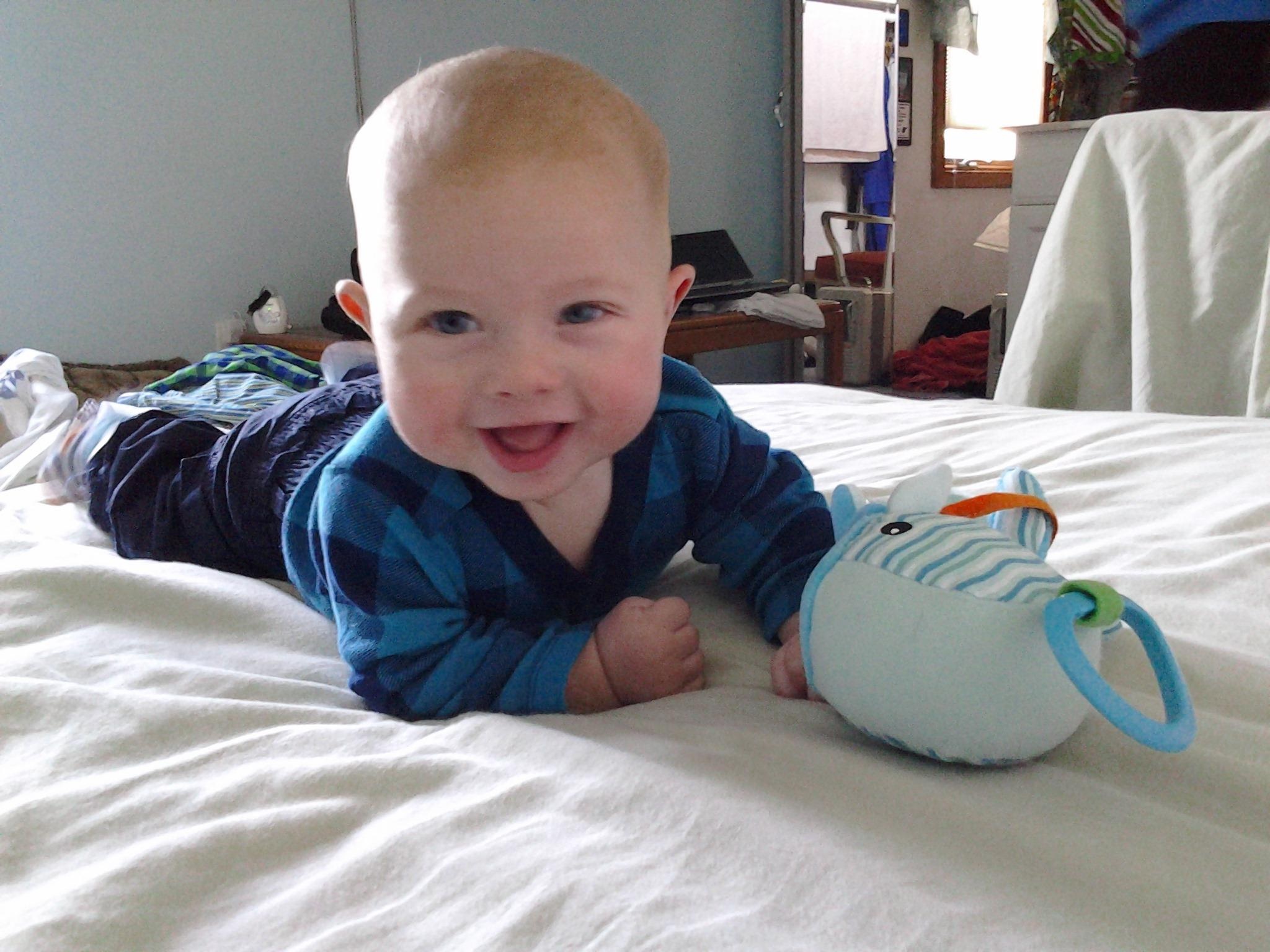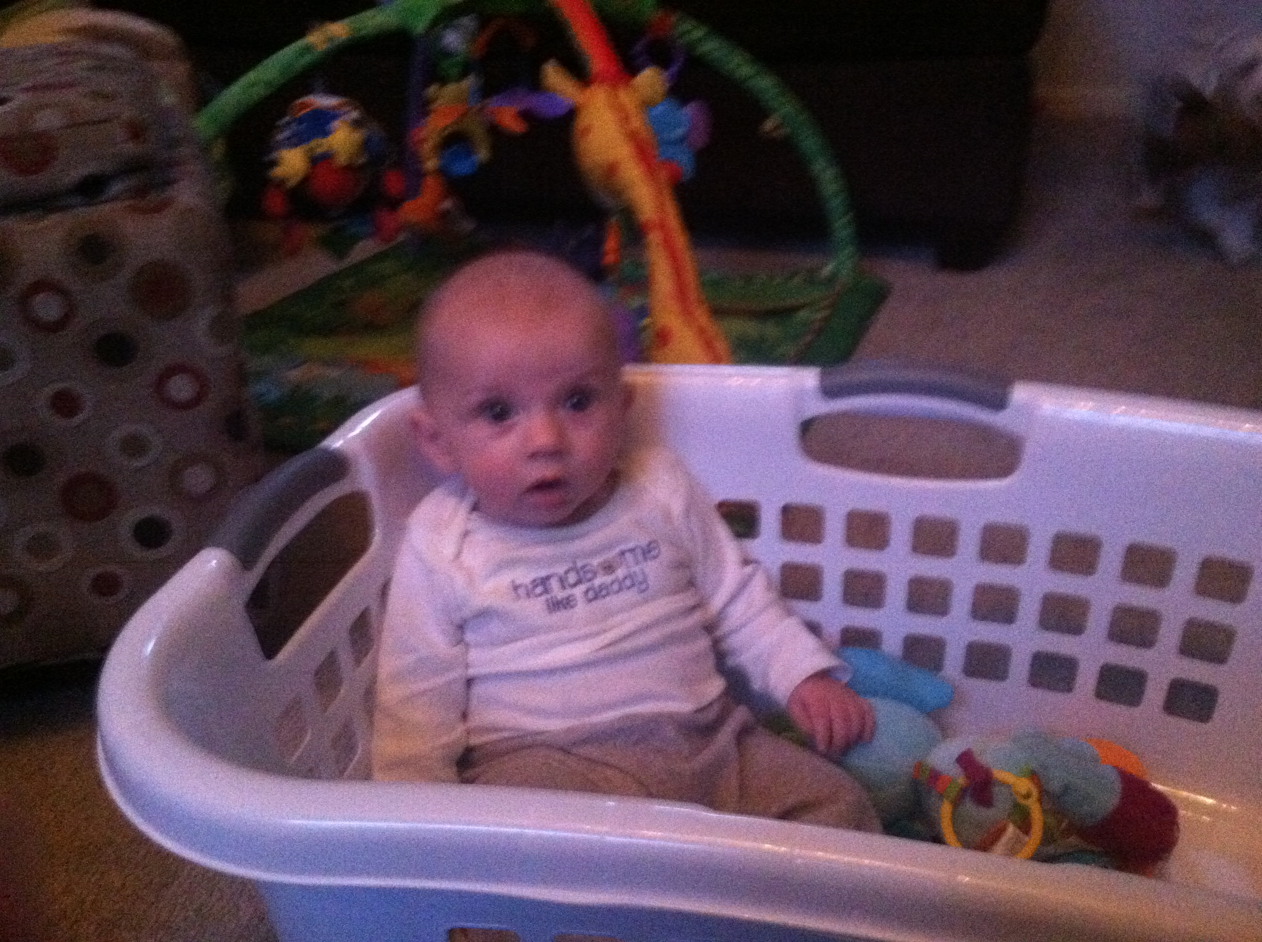 18 weeks; I buy him all these toys for Christmas and he is content in the laundry basket.