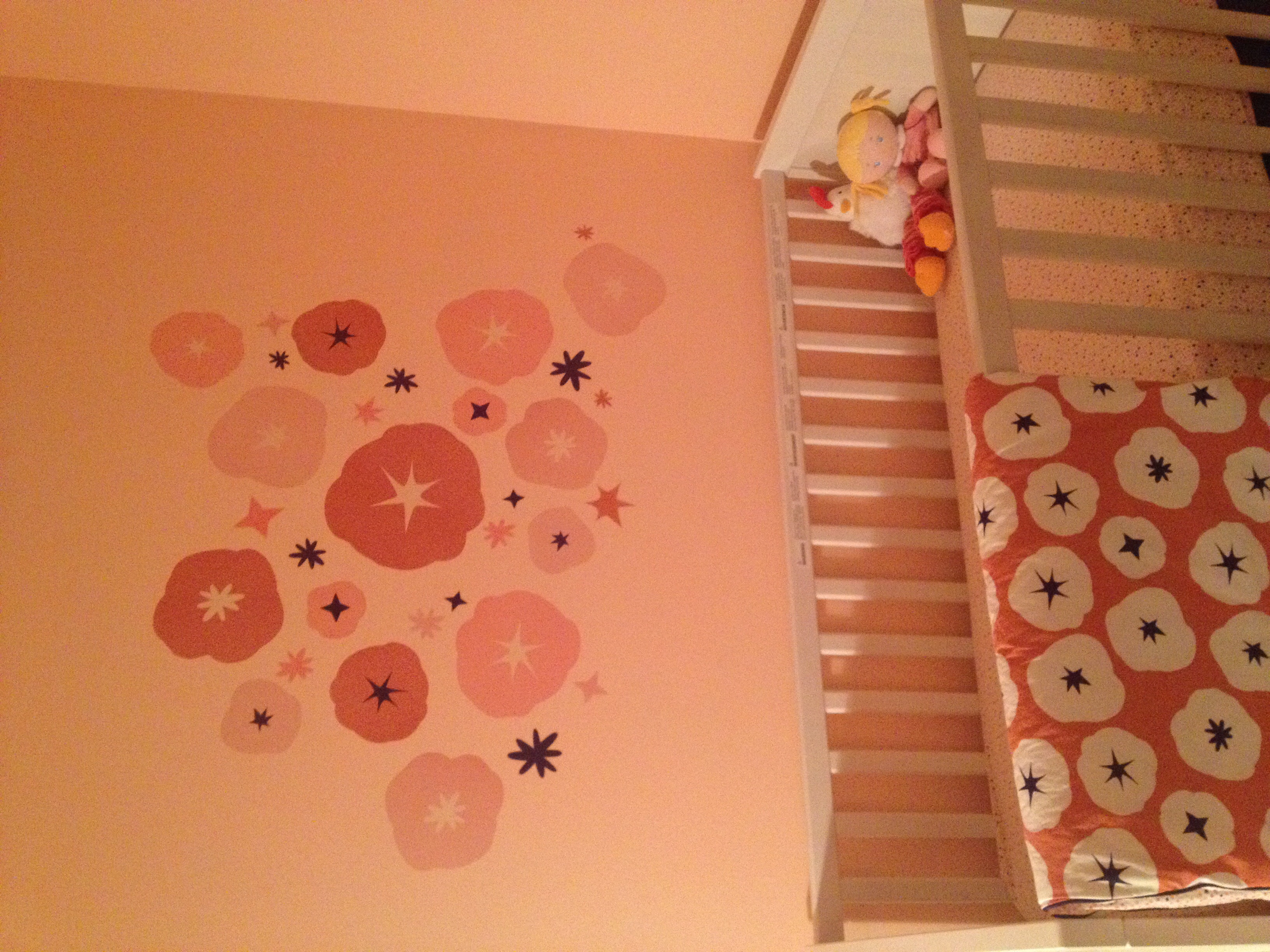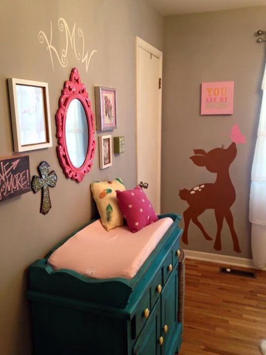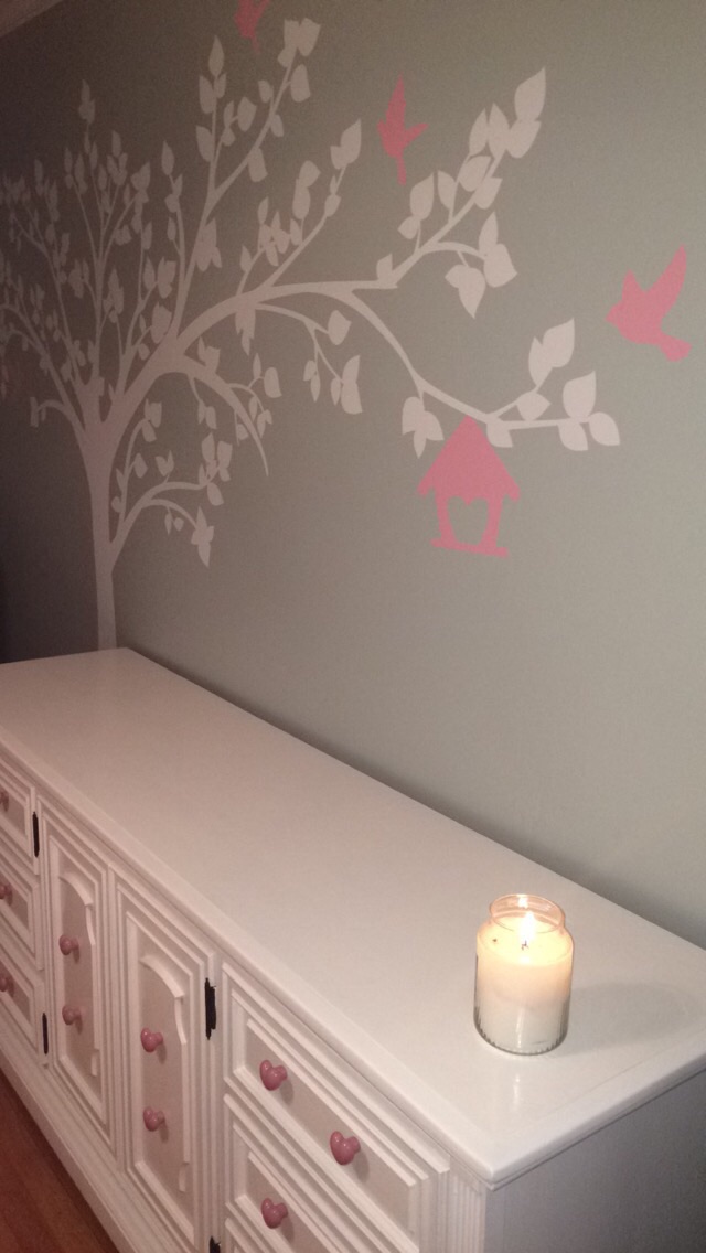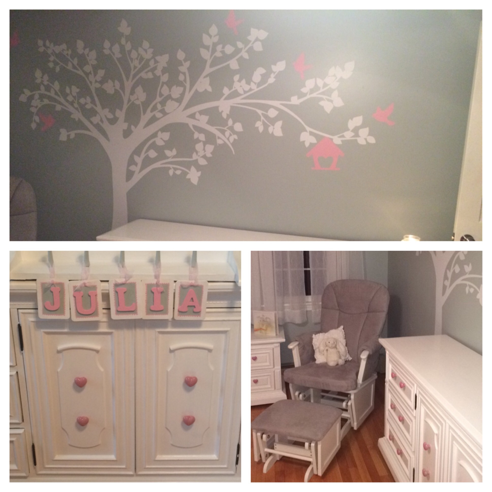 I can't seem to be able to attach a picture. We're quite pleased with it. Walls are light green. There's birch trees with birds on the wall the crib is on. Our theme for her is woodlands...so there's also white decals for a few squirrels and a buck.