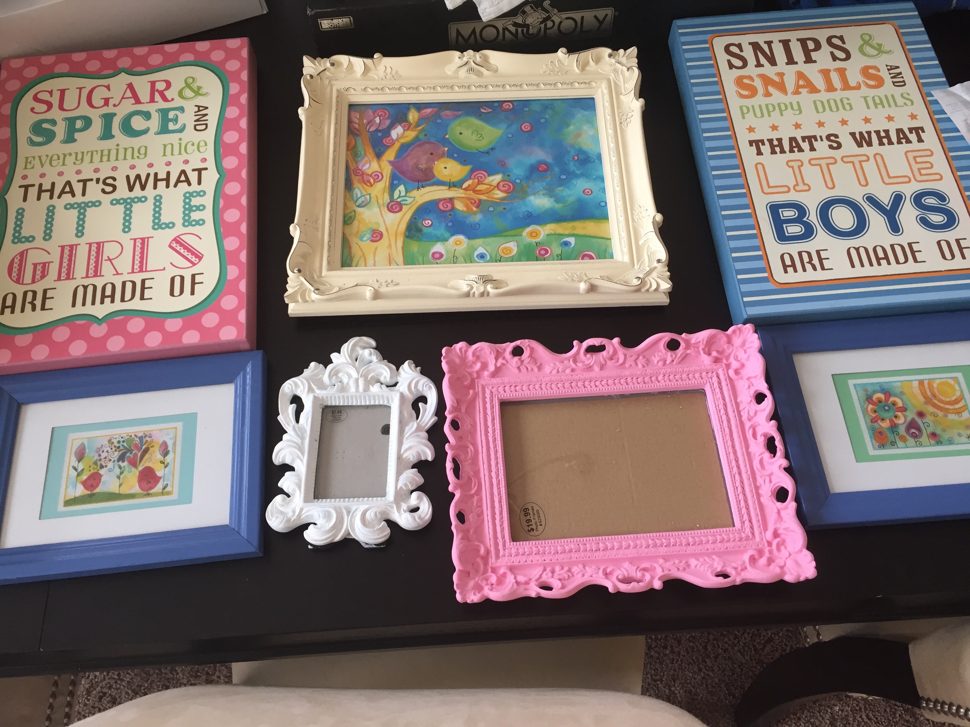 One ruined TV tray later, and we have picture frames for the nursery! I painted/distressed for a collage to go above the dresser (I didn't make the little girls/boys art...not that crafty). I still have to get a couple of prints, but they should be good to go after that.