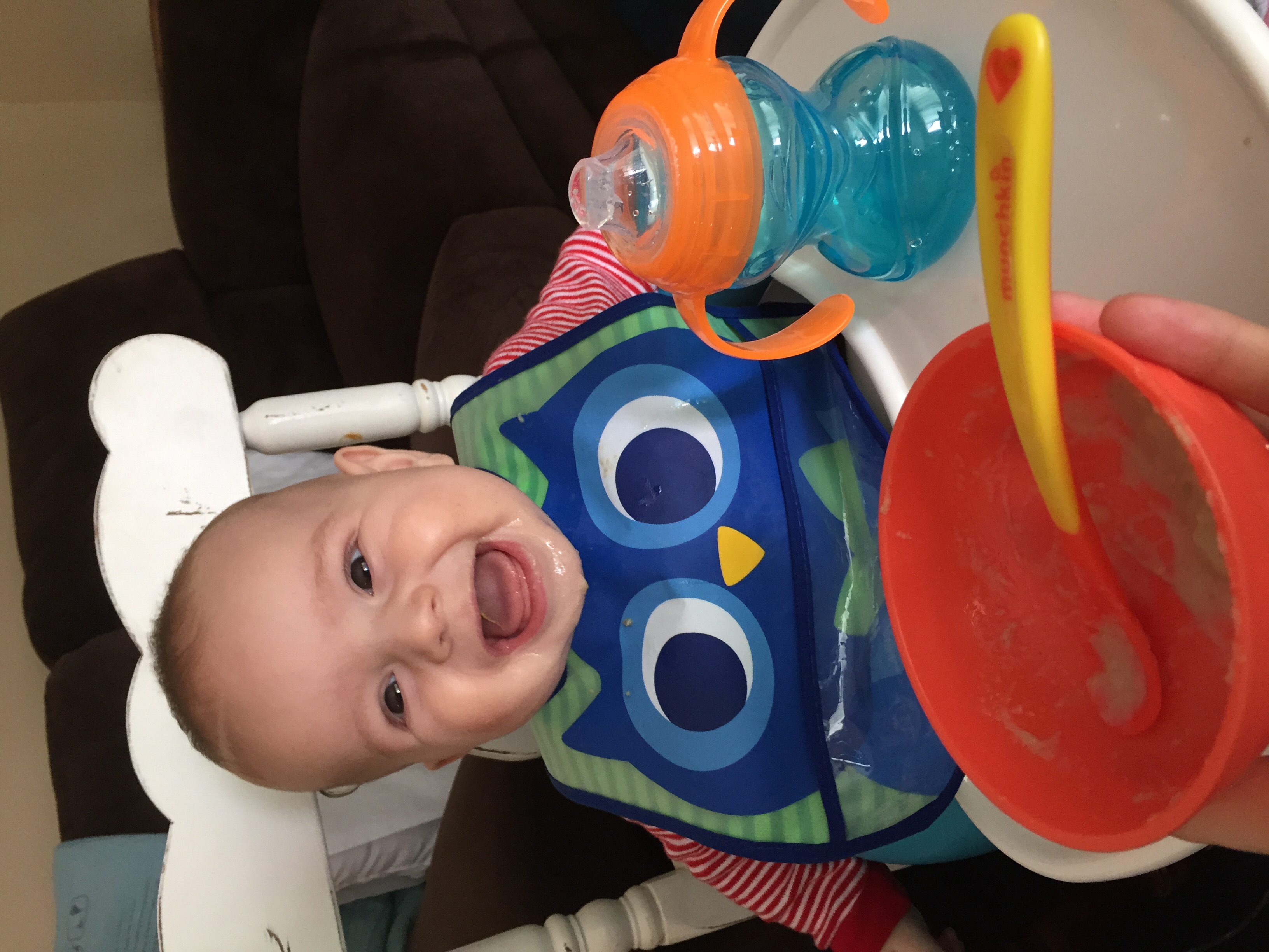 He moans for more, grabs the spoon from me, and otherwise can't get enough at mealtime. Oh, and he think food feels awesome in his hands