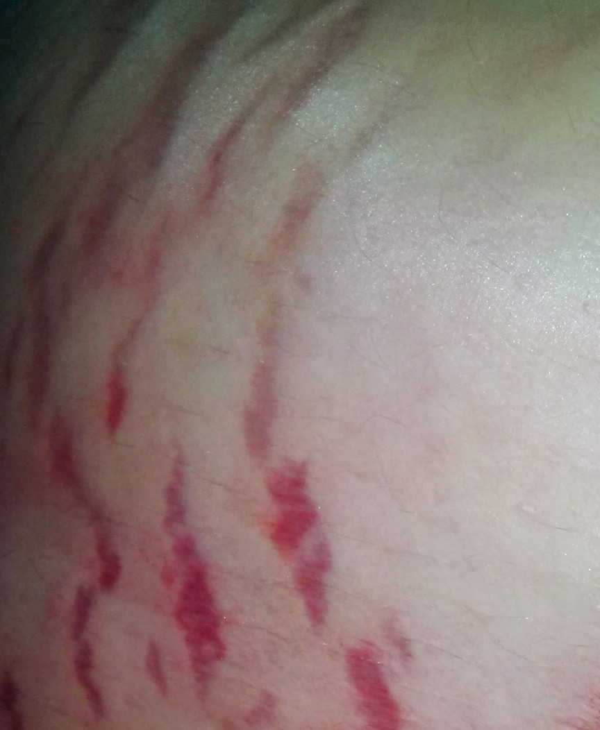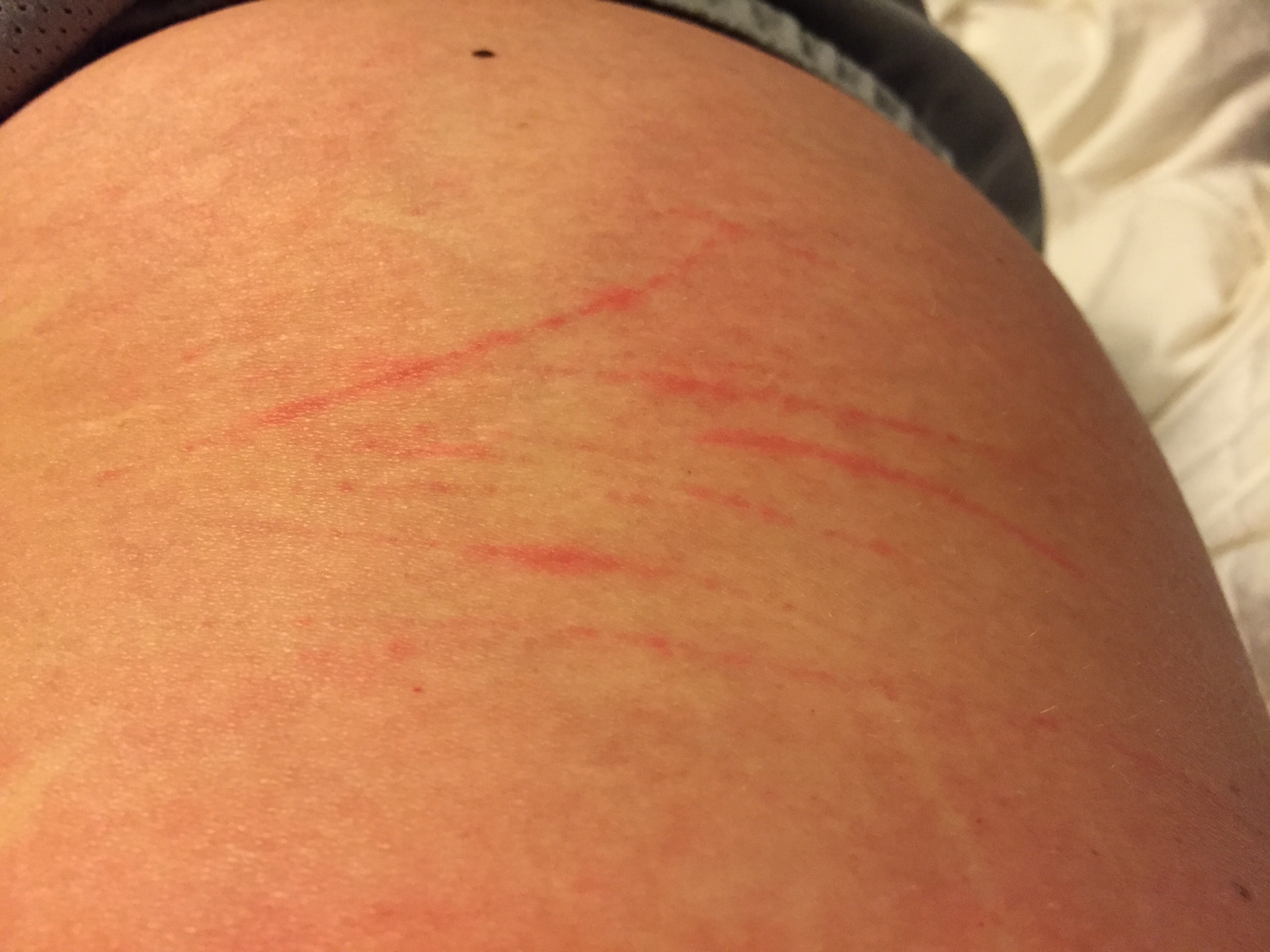 They look like scratches to me. These are stretchmarks. And yep, I'm proud of them. Lol I'm the weirdo here. These just popped up after a lot of itching... one day took a look under the belly and was shocked to see what looked like vertical bear claw marks.