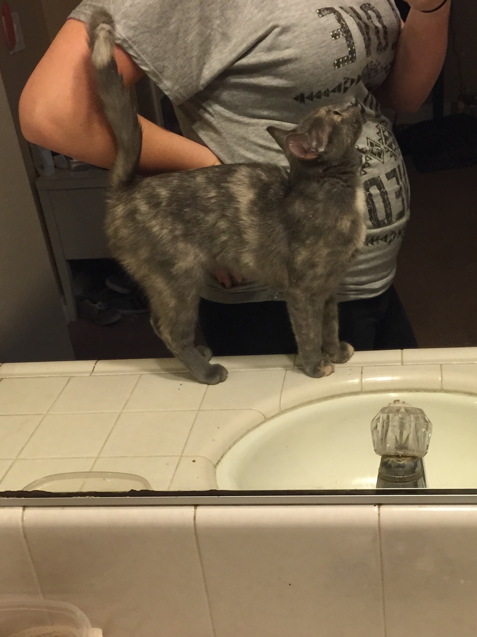 15w3d today. Looks like more of a bump when wearing maternity shirts like this one, but they're so much more comfortable than my regular clothes!!! Second pic is my cat trying to join in on the picture fun :-)