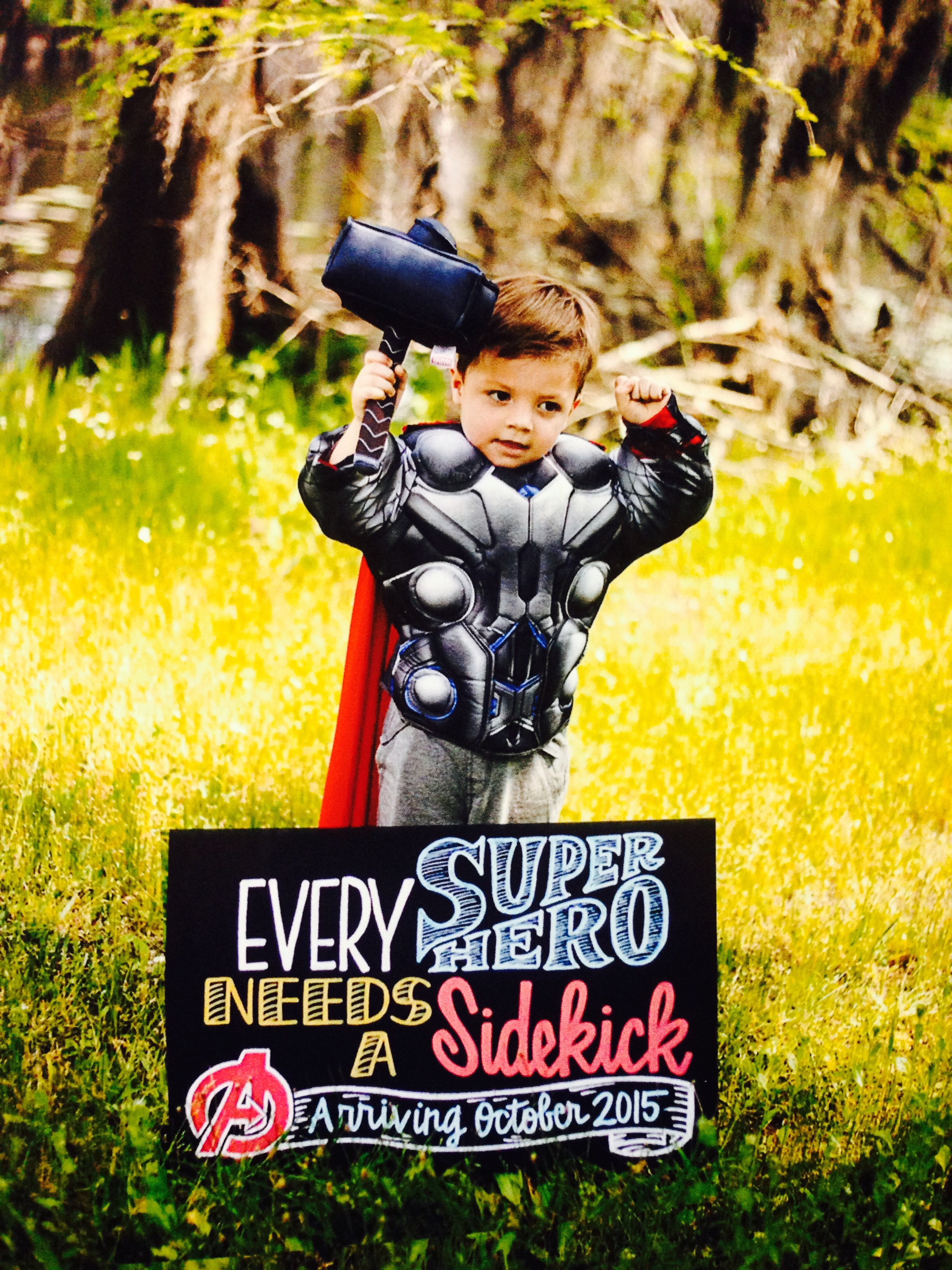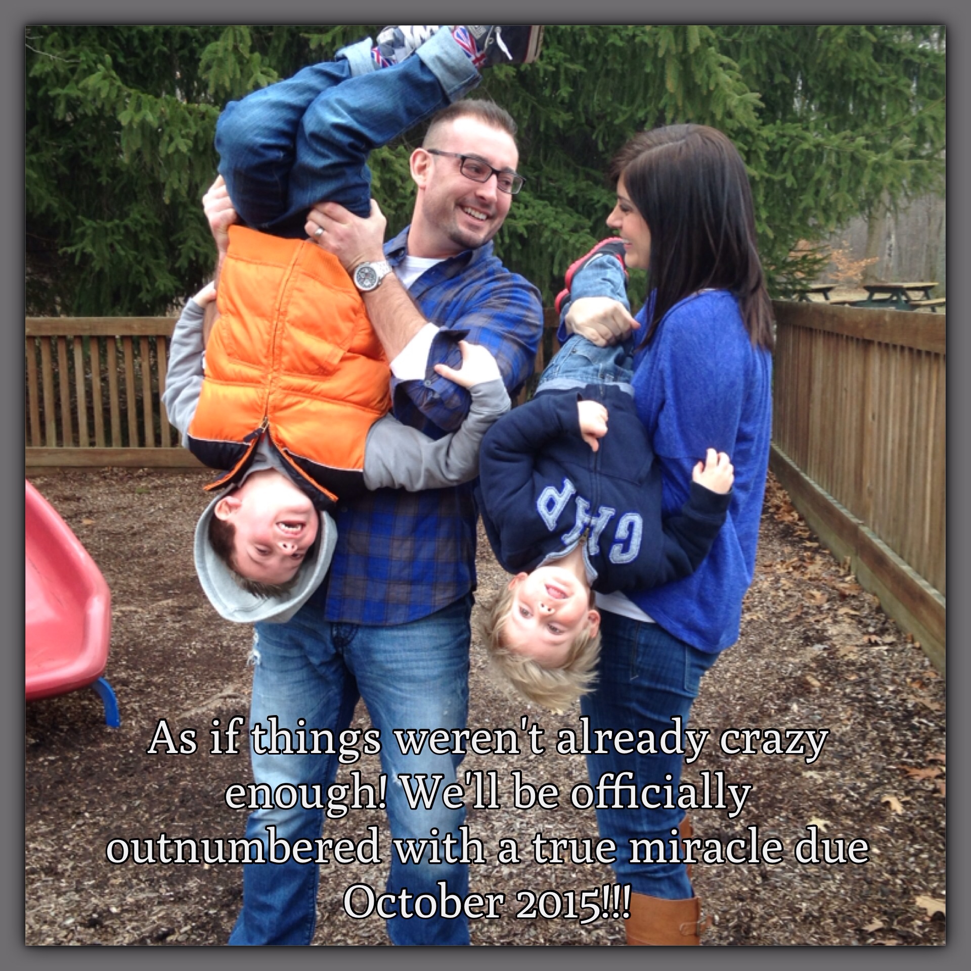 Here is our announcement and the post that went along with it on FB: It was almost 2 years ago we got the news that Beau had a very rare aggressive form of Lymphoma. As devastating as that was, the same day the doctors sat us down and told us our family was complete. The amount and doses of chemotherapy he would receive would for sure leave him sterile. After some tears I put it aside knowing this is what would save my husband and we already had 2 beautiful boys then 3yrs and 5 months old. Our only goal was to get Beau better. We weren't even sure we had plans for a third anyways. I finally and totally gave it to God and let the idea go for good this December and sold all my baby stuff the beginning of the year!!!!! I was a content and already overwhelmed mom to two busy boys and finally had my husband's health back! Life was good! Well let's just say God sure has a sense of humor and is definitely still in the miracle business!!!!! To say this was a surprise is an understatement! We are excited to finally announce that this October we will add a little miracle to our family! I'm also convinced my husband is really a superhero!!! Lol!