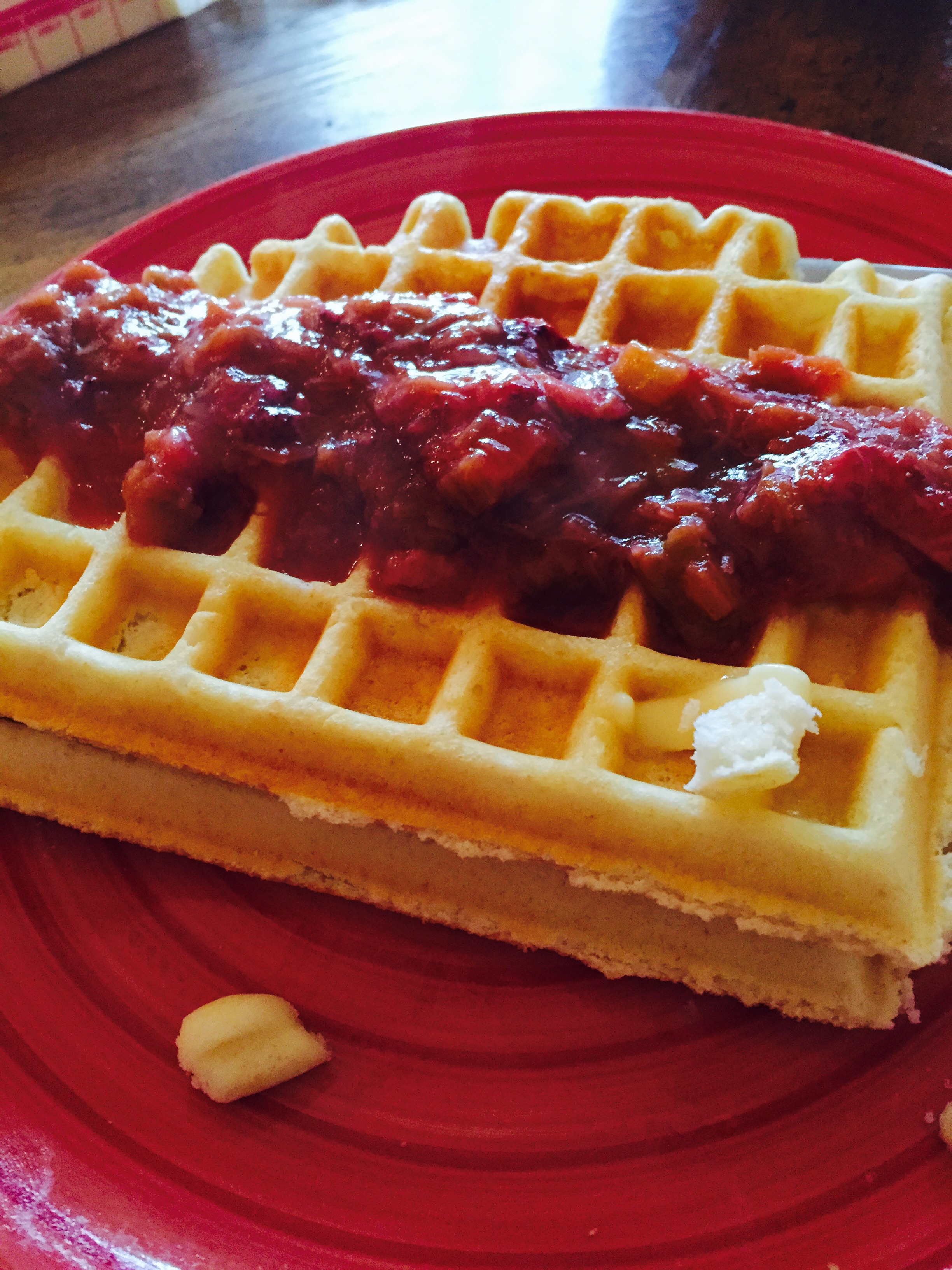 Look what I had for dinner! All this damn talk about waffles wormed its way into my craving subconscious. I added strawberry rhubarb sauce...nom, nom, nom. I wish I had whipped cream.