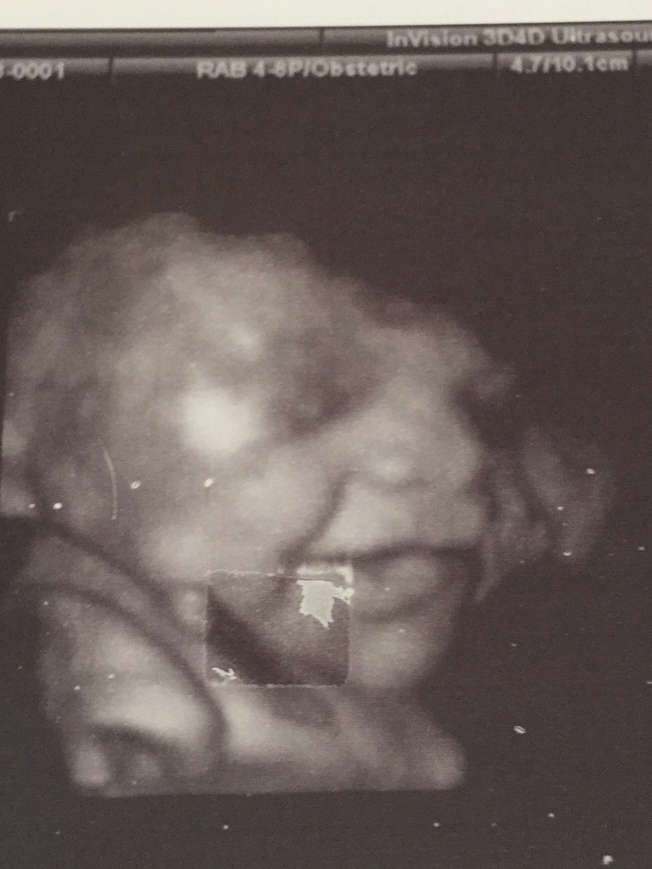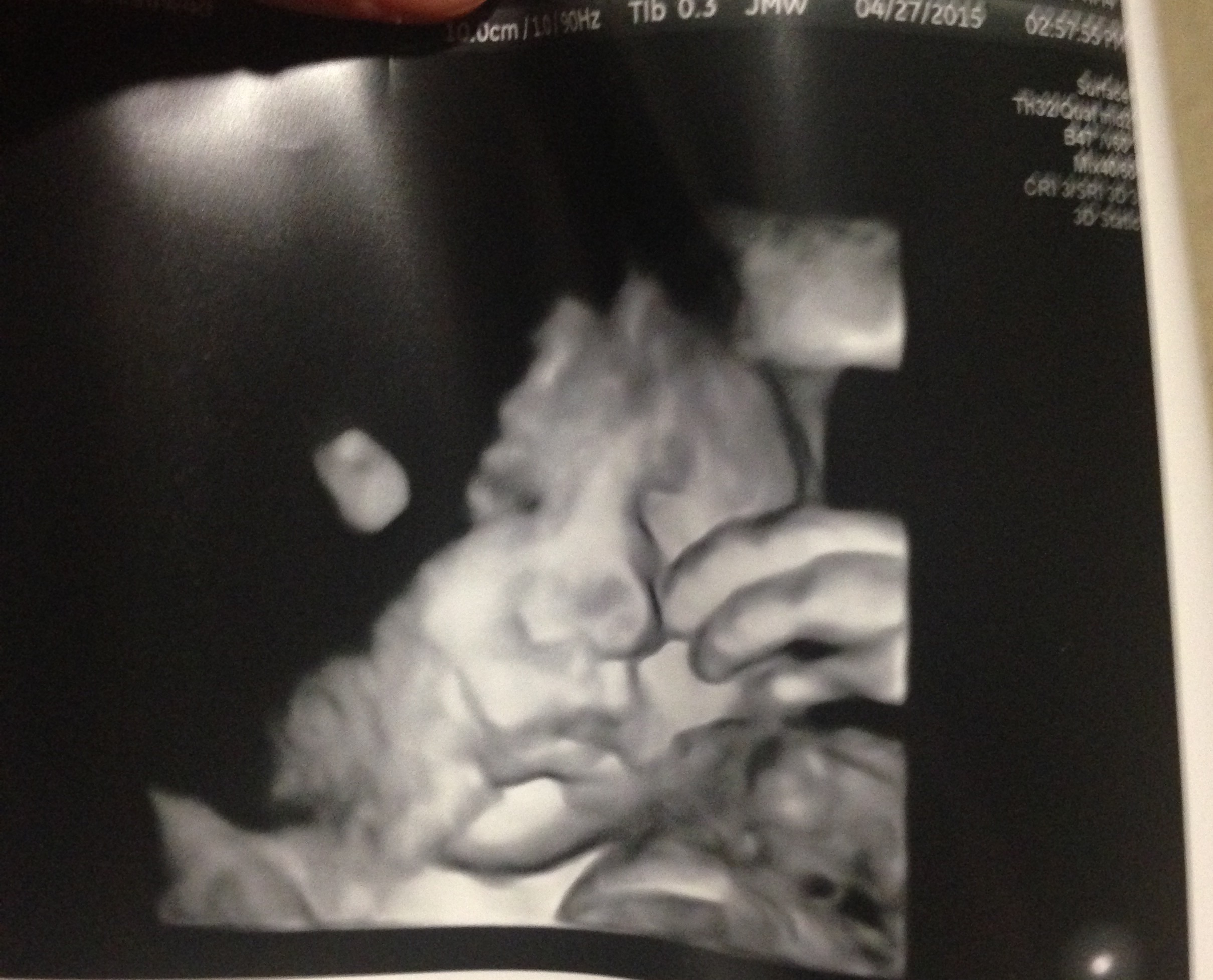 Our anatomy scan when LO was sucking on her hand. Also, at our ultrasound with the high risk specialist she had her elbow covering her eyes...like cmon I'm trying to sleep here.