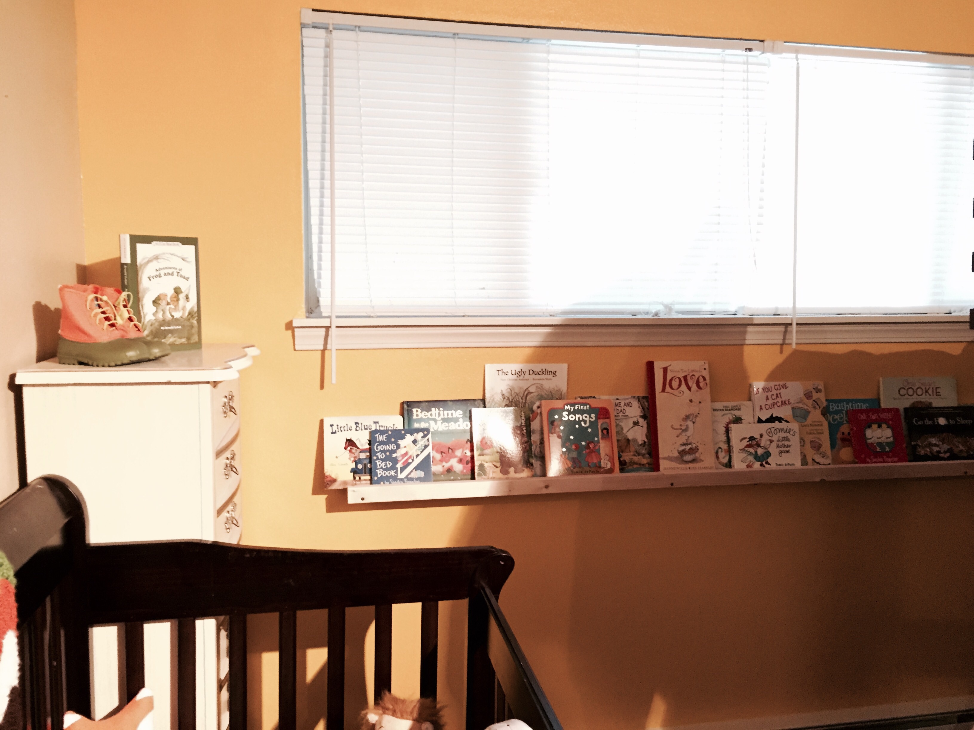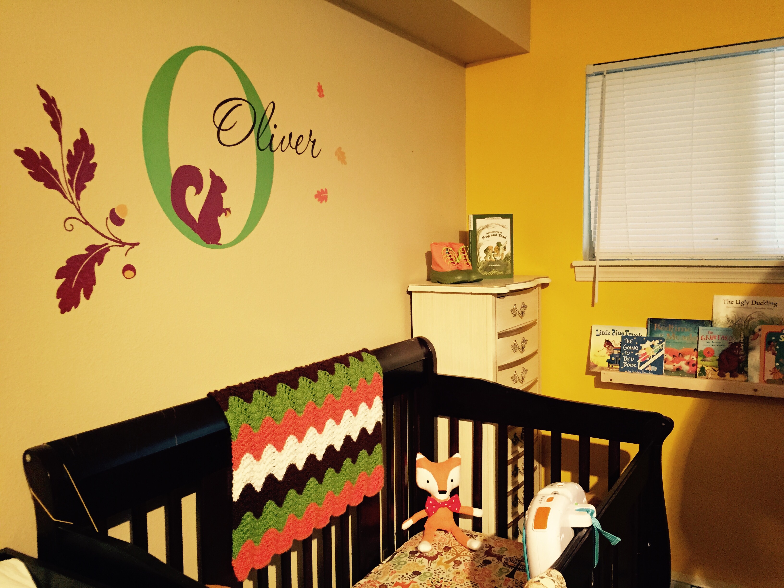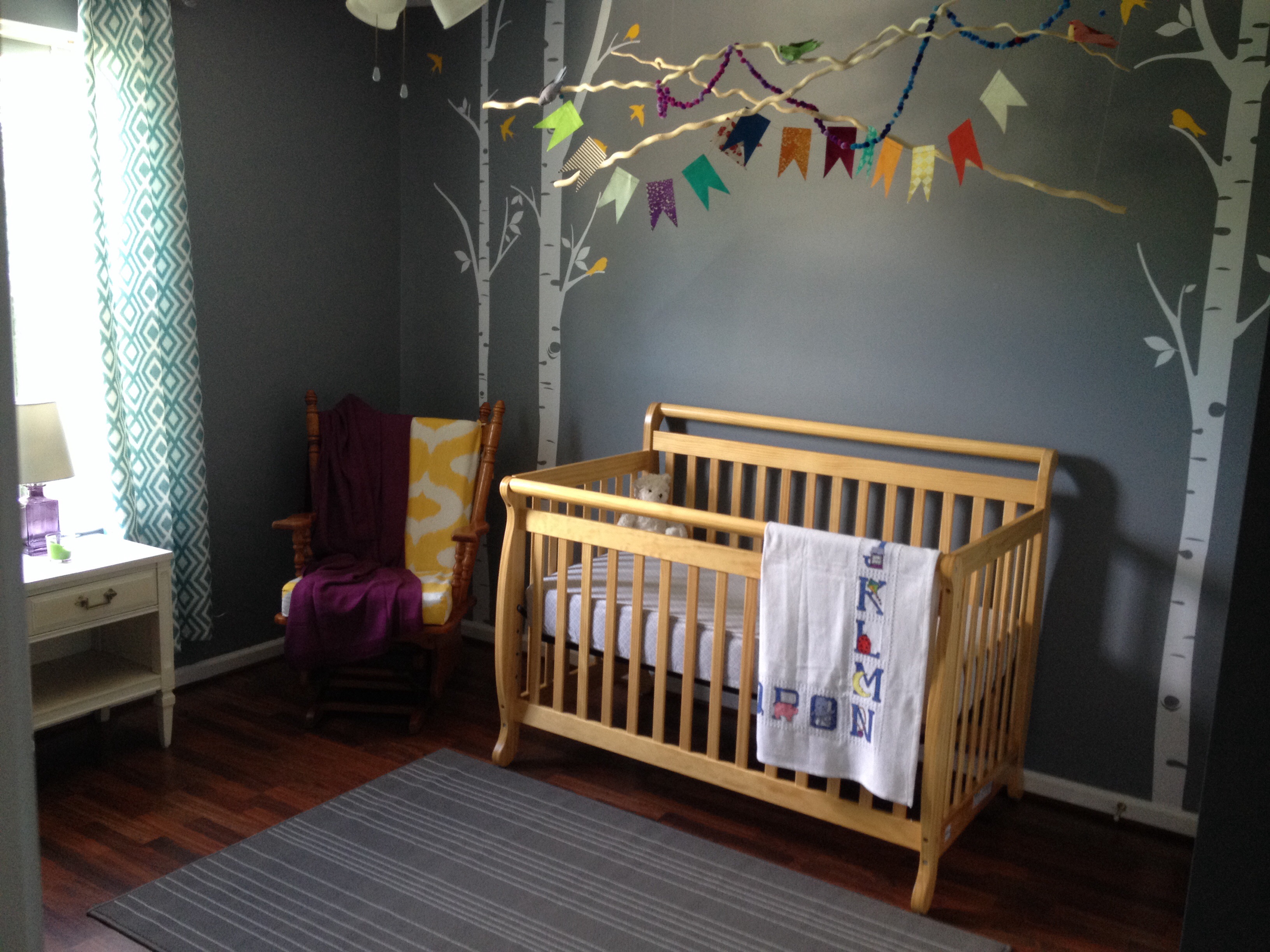 Our nursery is our bedroom!! We have half the room and he'll have the other. I so wish we lived in more than a 1bd apt but we made it work. These are the only pics I have right now. The crib mobile is missing and the changing table on the left. We also strung ABC cards that are woodland themed along the ceiling.
