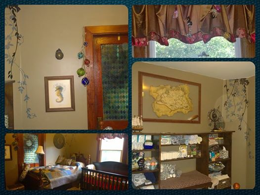 I love how this is coming along. It currently has 6 glass sea creatures dangling from a ships wheel anchored to the ceiling with a brass hook in front of the window (where light can make it sparkle). I have 6 more animals coming and would not be surprised to receive others. It has a whale from "Aunt" Wendy, a hermit crab from Aunt Lori, a pufferfish from Sandy, a seahorse from Pappy, an Octopus from me, and a dolphin from our babymoon (it was a gift in our room). It also has an angelfish for good measure. I will be adding: a jellyfish, sanddollar, starfish, seashell, sea turtle, and snail, as well as seaglass from Grandma Corder and some doubloons too.