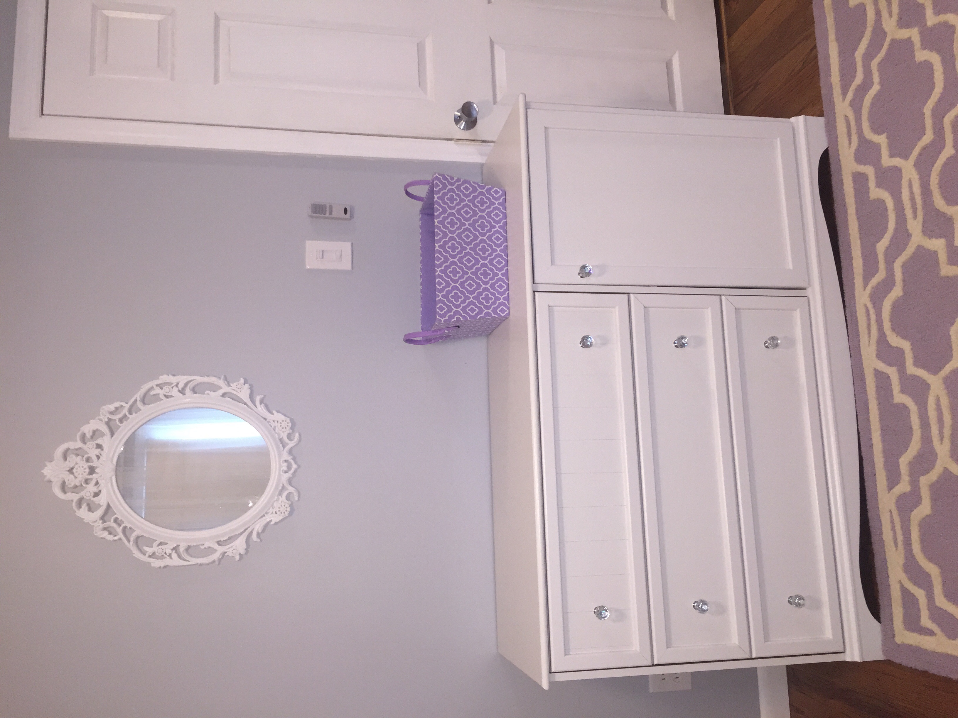 My dad built me this desk/wall unit in middle school and my sister and i originally used it as a dresser. I padded the desk as a changing table, with diapers and swaddling blankets on the shelves above. Bottles supplies are currently left and right. From there down, there are baskets on every shelf for clothes and two large baskets below the changing table full of books. An owl piggy bank i love has a home here as well and the mantle is perfect for decorations.